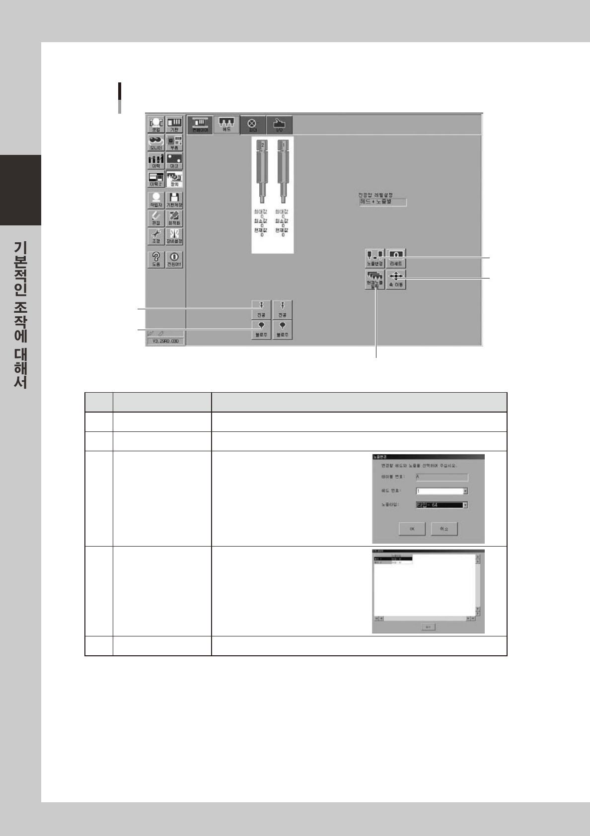 2-14 2 ■ 헤 드 수 동 조작 「장치」 ー 「헤드」화면 1 2 5 4 3 28 2 0 7- N 8 - 0 0 버튼명 기능 1 진공 각헤 드의진공 ON /OFF 를실행합니 다 . 2 블로우 각헤 드의블로 우ON /OFF 를실행 합니다 . 3 노즐 변경 「노즐변 경」대 화 창이표시되면 ,헤드및노 즐타입을지 정해 서노즐 체인 지 를실행 합니 다. 4 현재노즐일 람 …