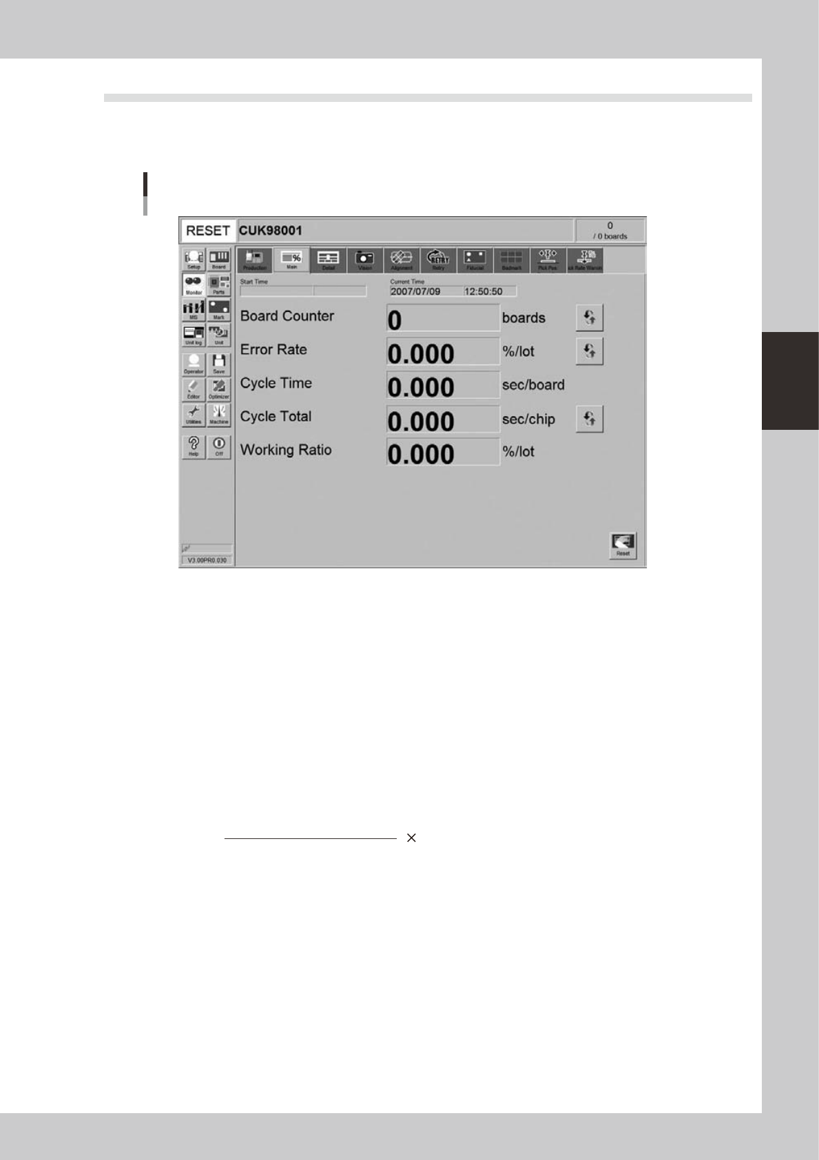 The [Monitor]-[Main] tab screen shows you the real-time production status such as the board count and cycle