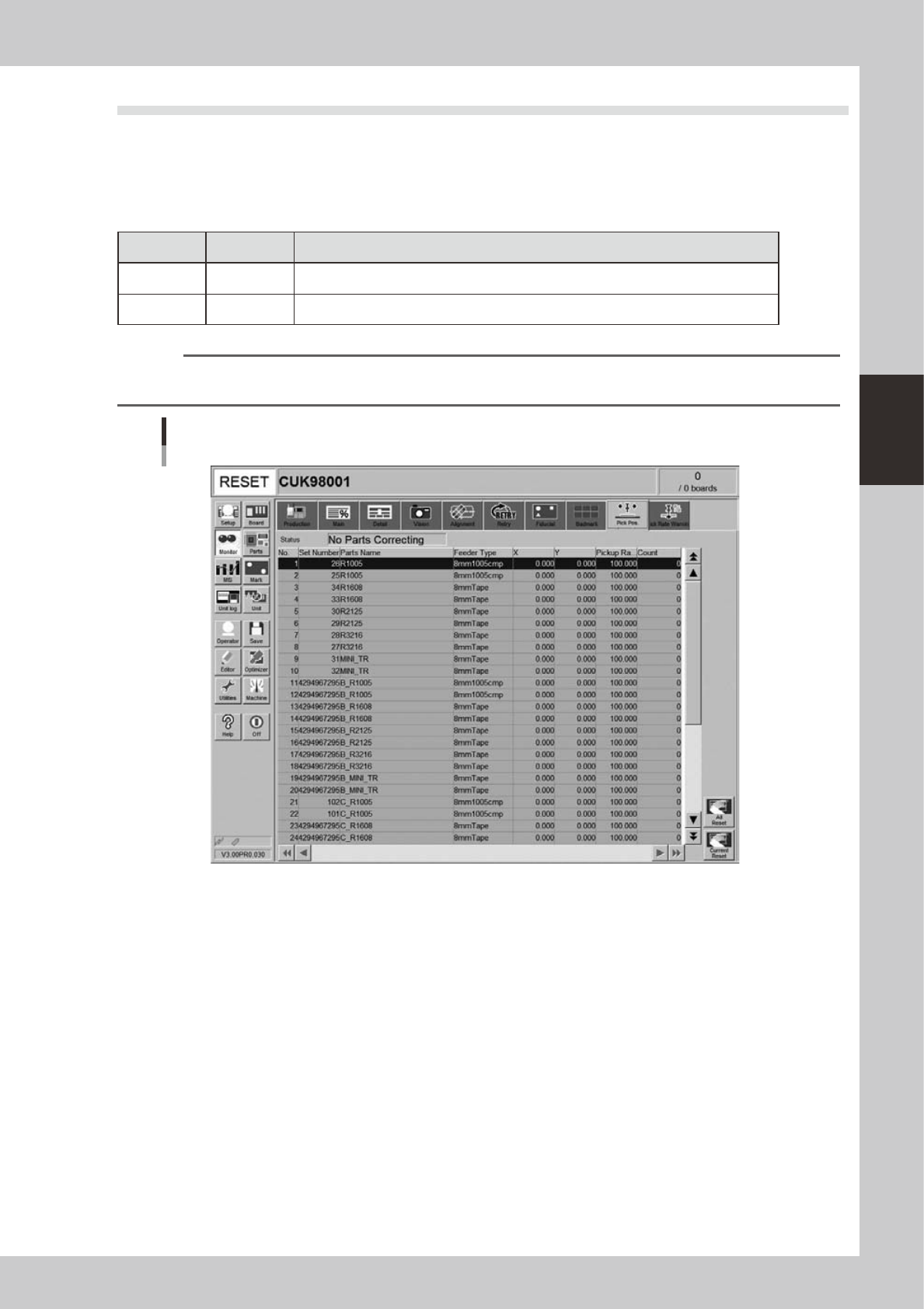 Displays the component pickup rate of the nozzle for which the pickup position offset function is on (enabled).