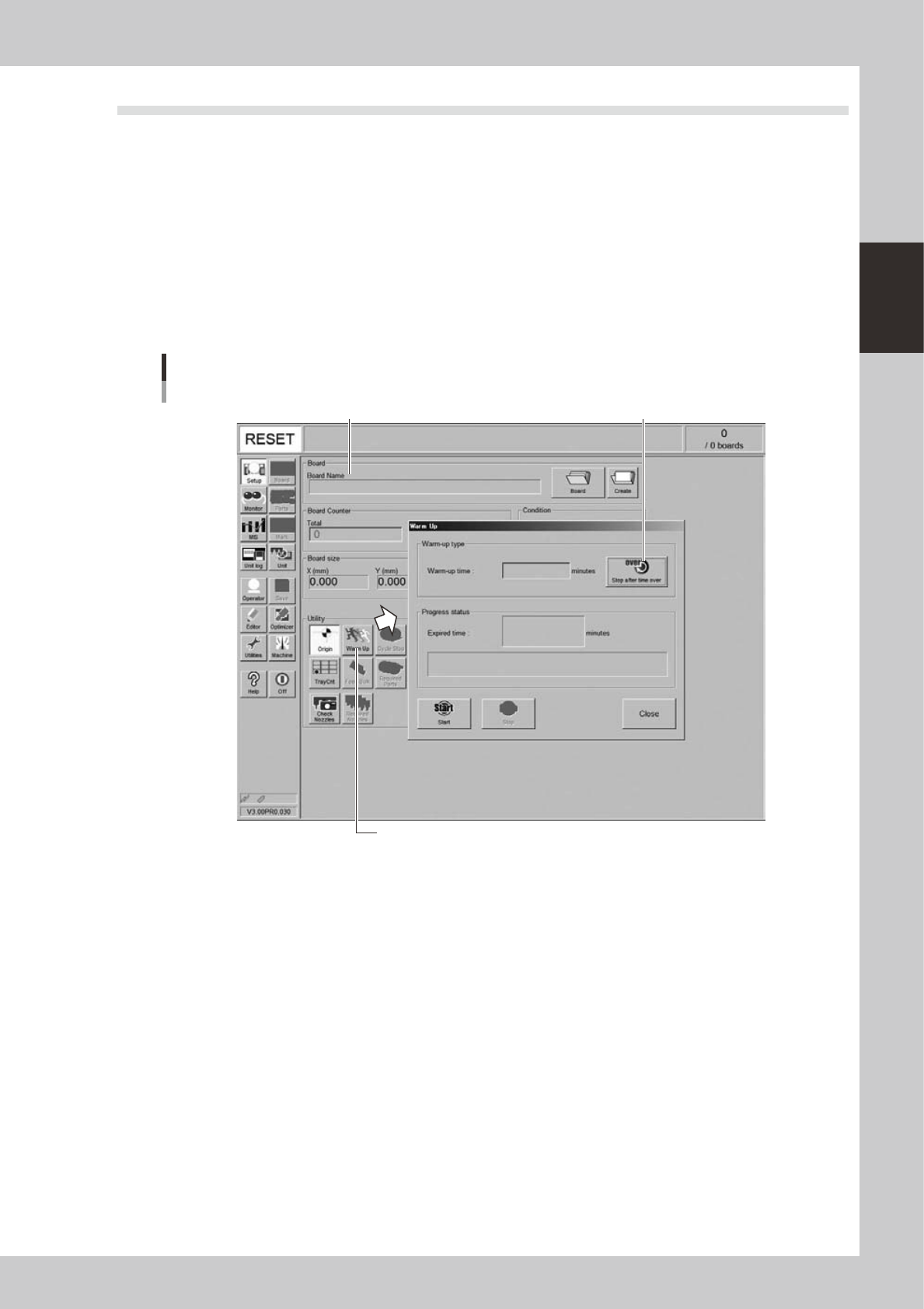 Press the [Warm Up] button on the Setup screen.