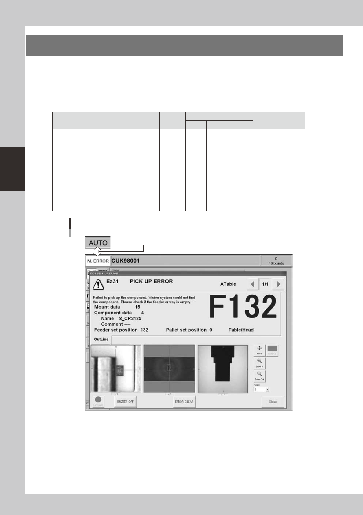An error dialog also appears on the operating screen, and the status area alternately displays "AUTO" and