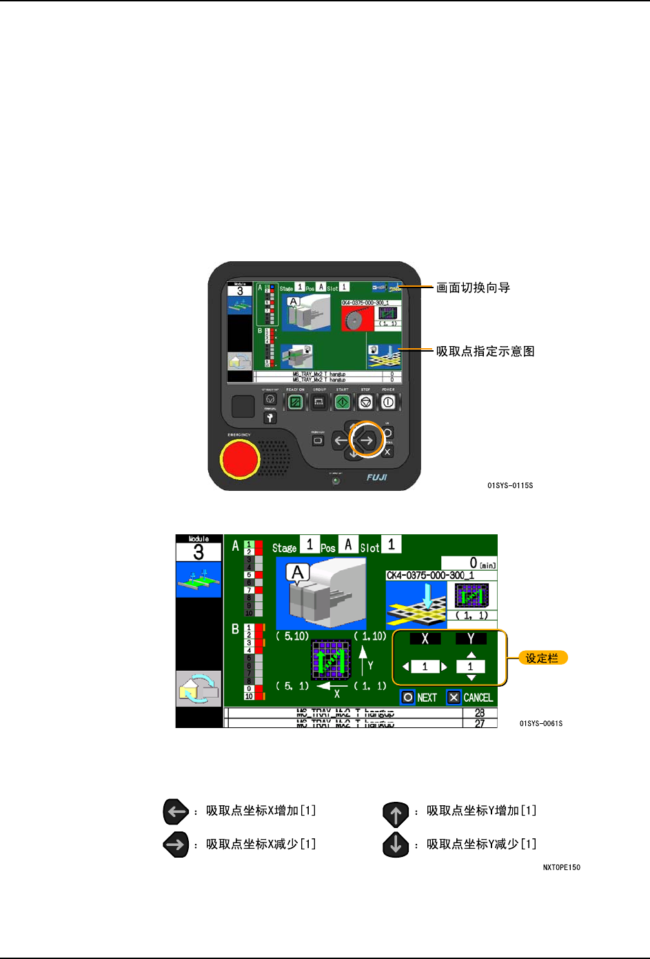 2. 显示吸取点指定画面。请设定吸取点的 X、Y。通过按下箭头键,X、Y 的数值会变化。
