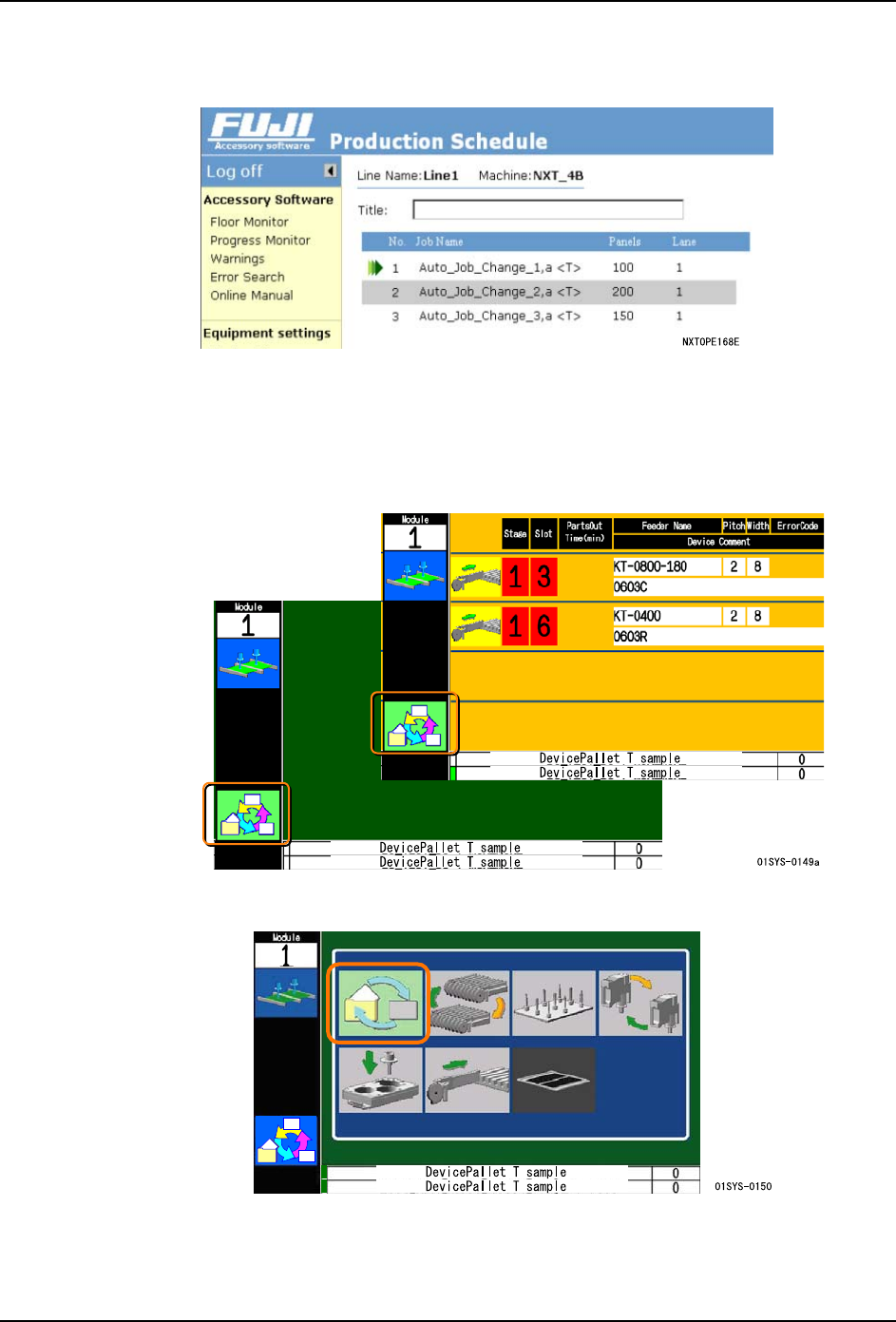 SYS-NXTIIc-4.0S 4. 生产 NXT IIc 系统手册 123 3. 使用箭头键选择 Job 切换图标,然后按下 OK 按钮。 完成生产中的电路板后,从前工 序的模组开始以模组为单位,顺序切换 Job 并进行换线。 3. 手持式扫描器模式 通过使用手持式扫描器读取生产 指示书等的条形码,指示开始自动换线。 另外,使用该功能时需要以下的 选项。 · 条形码读取器 (连接在 PC 上使用) · 特定 Job 的条形码 (生产指…