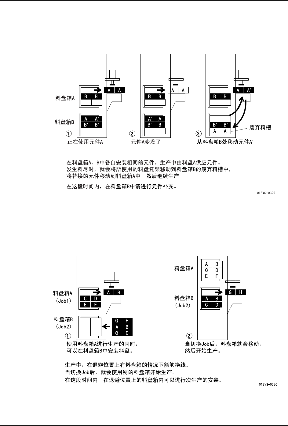 料盘箱 A、B 各自根据 Job 被运用的模式。生产中,在退避侧的料盘箱中进行次生产的准备,