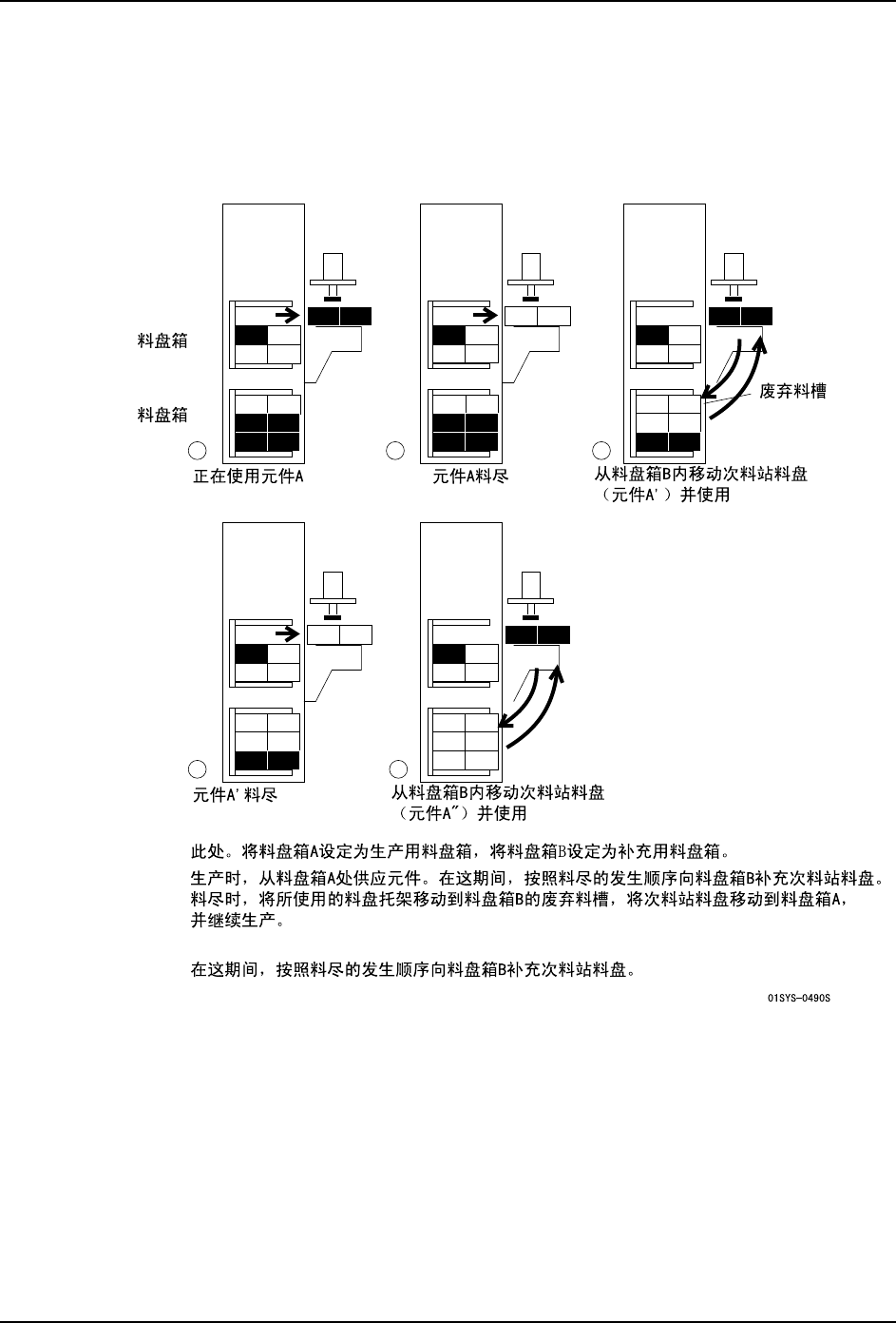 SYS-NXTIIc-4.0S 4. 生产 NXT IIc 系统手册 141 运用 3:生产中向补充用料盘箱补充元件 在 2 个料盘箱内安装相同的元件, 一个料盘箱作为生产用料盘箱, 另一个作为补充用料盘箱 进行运用的模式。 因为发生料尽的料盘移动到补充用料盘 箱的废弃料槽, 所以操作者根据向 导除去该料盘,进行元件补充。 备注 )插图说明了来自料盘箱 B 的补充模式。通过辅助软件的机器功能设定,也能够按照来 自料盘箱 A 的补充模式进…