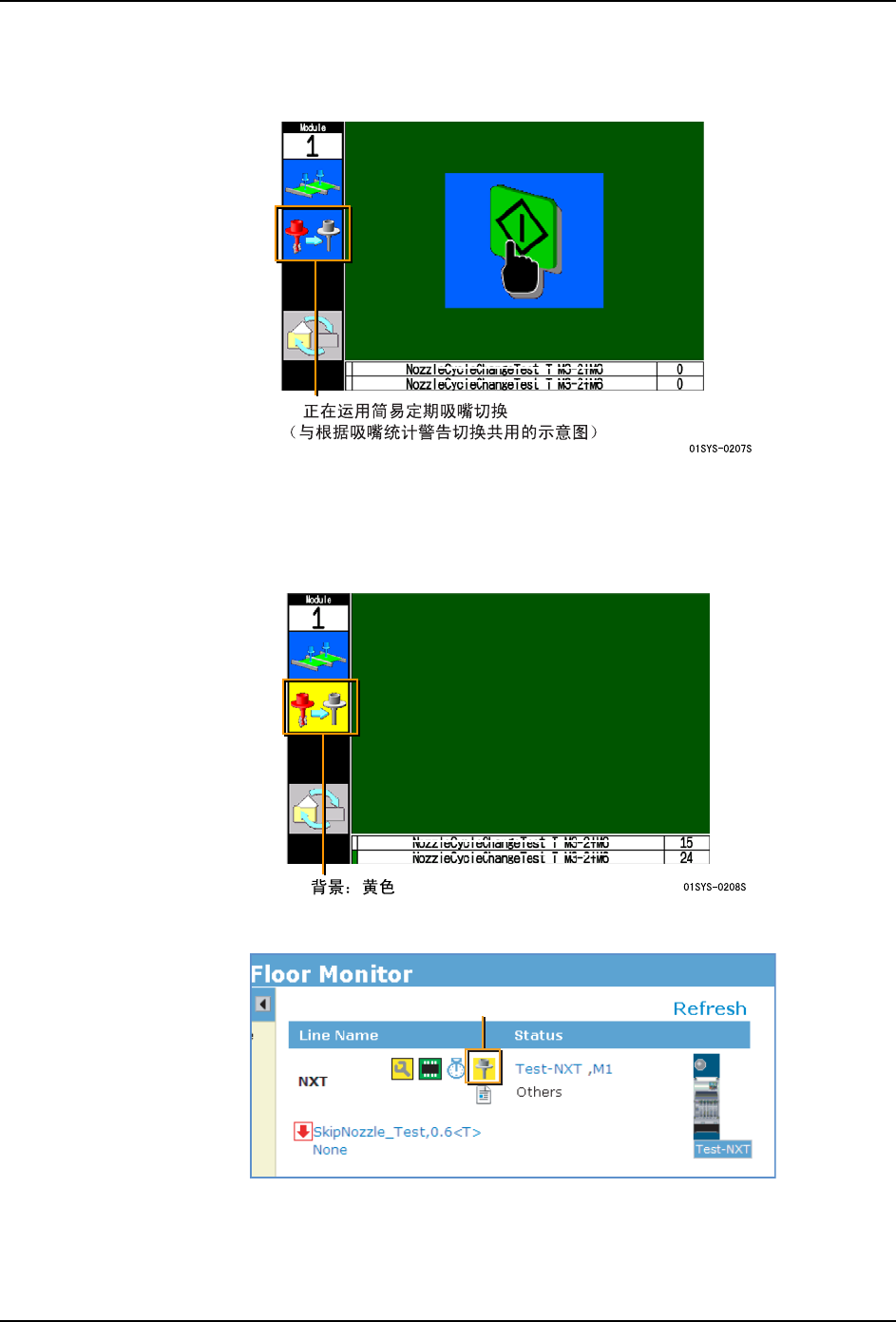SYS-NXTIIc-4.0S 4. 生产 NXT IIc 系统手册 175 简易定期吸嘴切换功能的运用 如果设定了简易定期吸嘴切换, 操作画面的状态区域就会变成以下。 开始运转后, 当生产了指定块数的电路板时, 就会将工作头上的吸嘴切换成吸嘴置放 台内的 预备吸嘴。 此时, 操作画面的状态区域的示意图的背景变成黄色, 告知操作者吸嘴置放台内有需 要维修 保养的吸嘴。 在辅助软件的在线监视器上,吸 嘴图标的背景色也同时变成黄色。 如果吸…