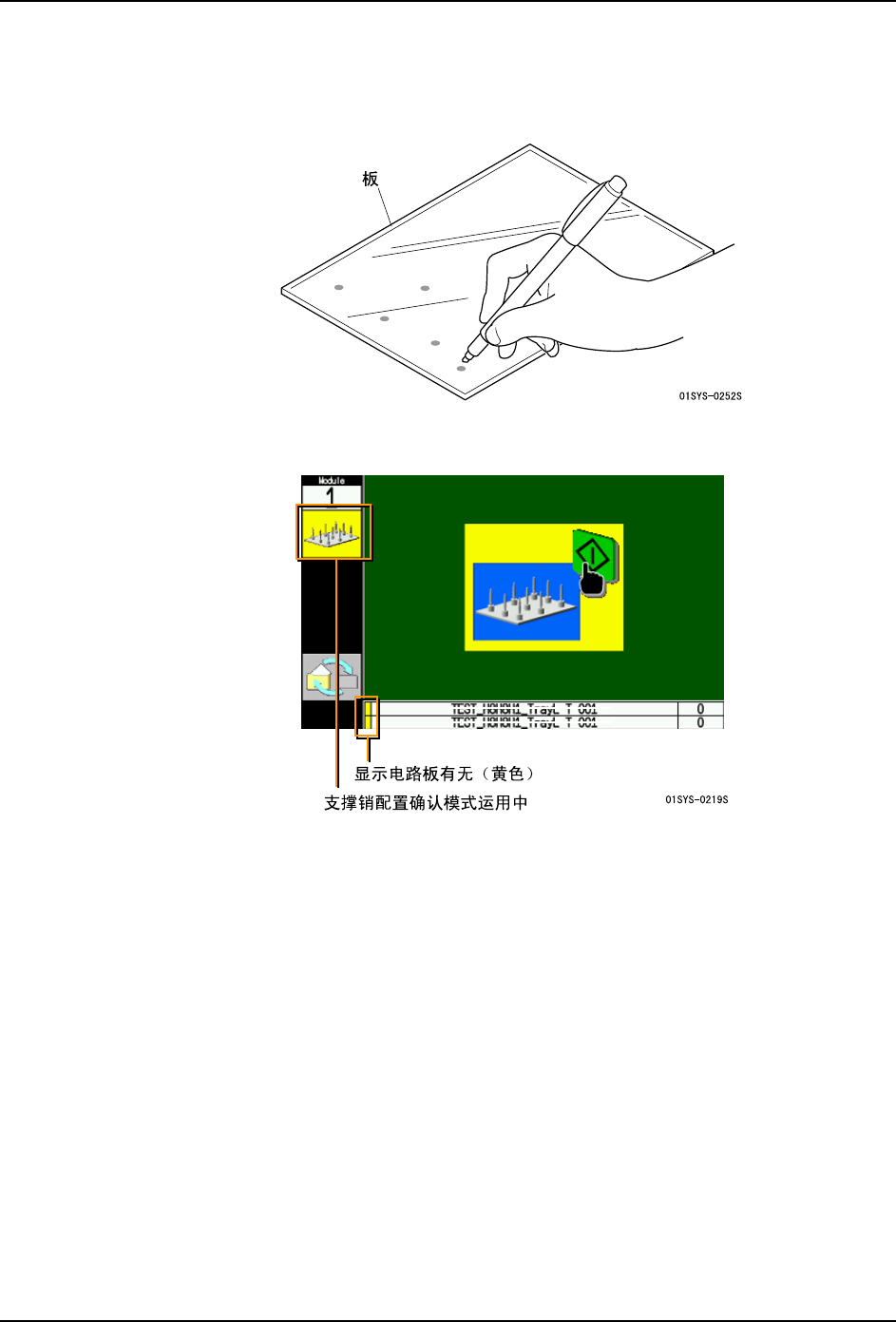SYS-NXTIIc-4.0S 4. 生产 NXT IIc 系统手册 181 3. 机器夹紧板并停止, 然后在操作画面上显示支撑销配置确认向导。 请按下 OK 按钮拉出模 组。 4. 请确认支撑销的配置。如果支撑销的位置与板上的标记位置不一致时, 请移动到正确的 位置上。 5. 确认了支撑销的配置后,请插入模组。 6. 在操作画面上显示电路板送出的开 始向导。请按下 START 按钮。 备注 )如果不需要在下一模组中进行配置确认,在按下…