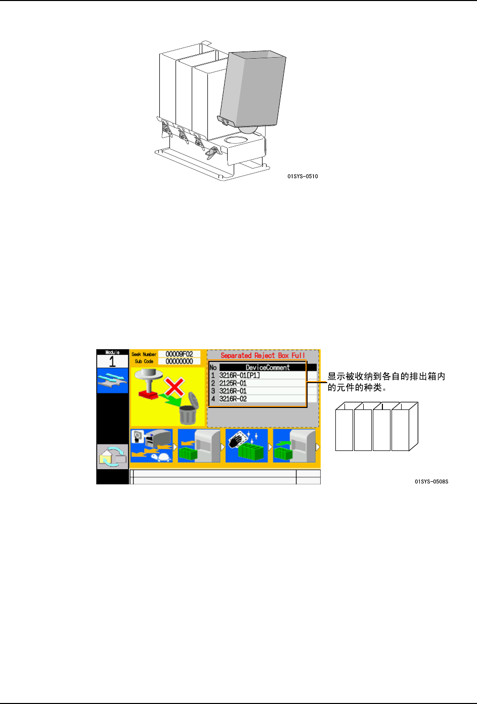 运转中,发生影像处理错误的元件被收纳到元件排出箱内。如果运用区分类型的元件排出