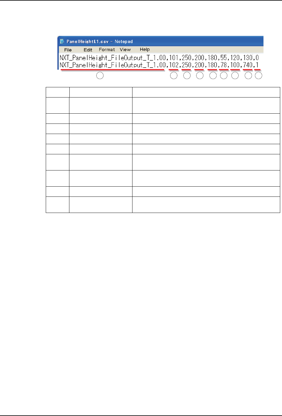 SYS-NXTIIc-4.0S 4. 生产 NXT IIc 系统手册 207 如何查看所取得的数据 请使用记事本等编辑器打 开所取得的文本文件。 以下说明文件内的各项目 。 号码 项目 内容 1 Job 信息 生产时的 Job 名和电路板的正反面 (T、B) , 以及修订 2 电路板 ID 生产时的电路板 ID 3 电路板尺寸 X X 方向的电路板尺寸 (mm) 4 电路板尺寸 Y Y 方向的电路板尺寸 (mm) 5 电路板旋转 电路板…