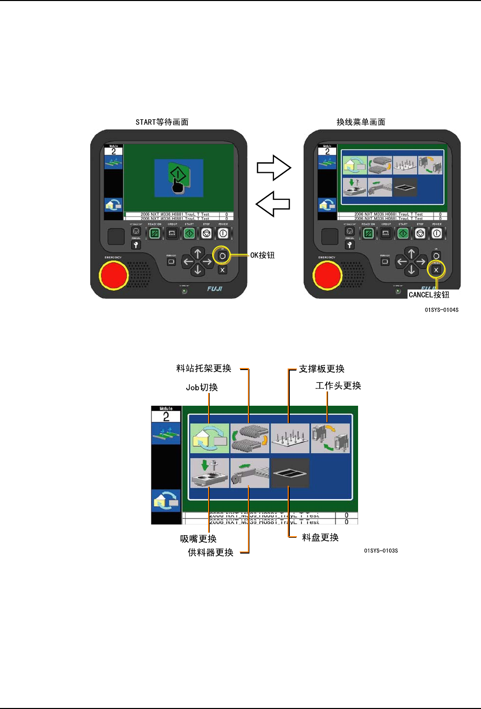 这时,在 START 等待画面上请按下 OK 按钮,切换到换线菜单画面。按下 CANCEL 按钮后就会