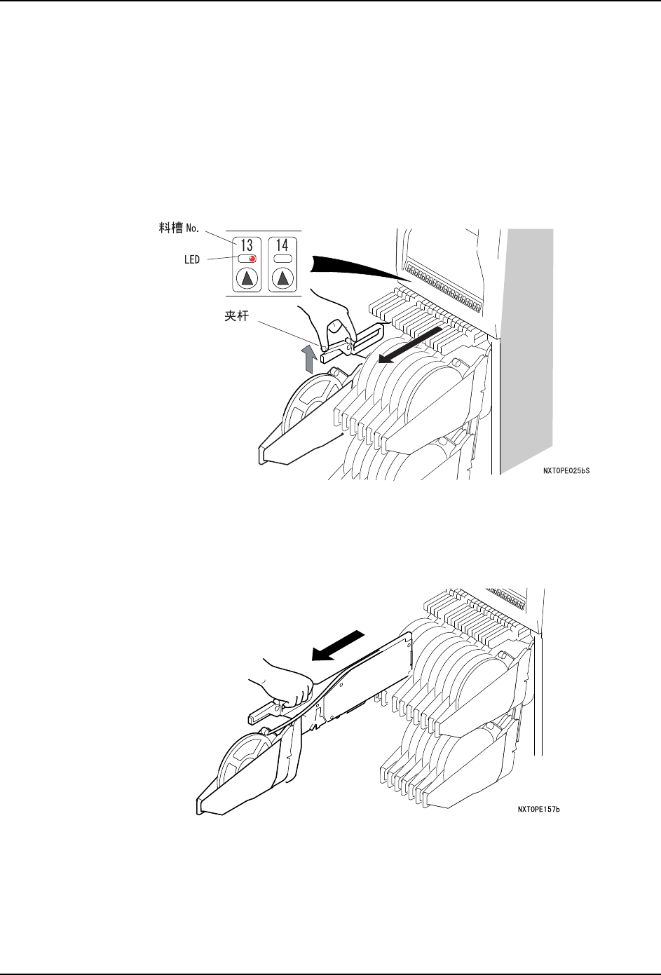 5. 换线 SYS-NXTIIc-4.0S 222 NXT IIc 系统手册 5.5.2 供料器的卸下和安装 运用 Fujitr ax Ver ifier 时, 需要有 供料器与料卷间的相 关设置。 详细内容请参 照 Fujitrax Verifier 用 户手册。 1. 如果安装在前面门上的 LED 亮灯 , 则说明该料槽 No. 需要更换或者检查。需要更换供料 器时如下图所示,请提起供料器的 夹杆解除锁定,将供料器的电源设置为 OF…