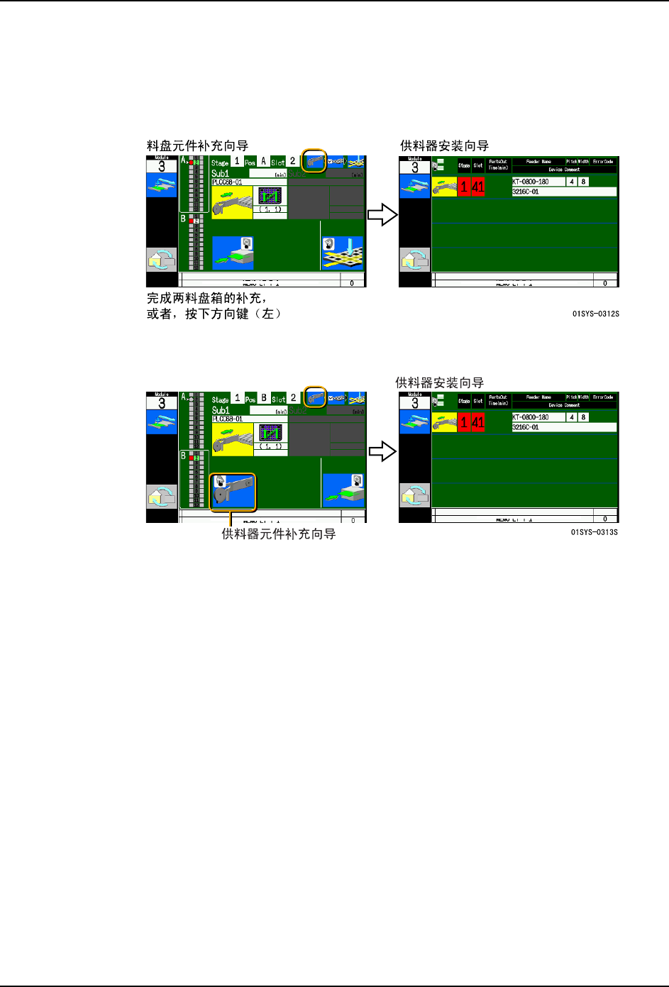 这时,完成料盘的安装,或者按下操作面板的箭头 (左),就会切换到供料器安装向导