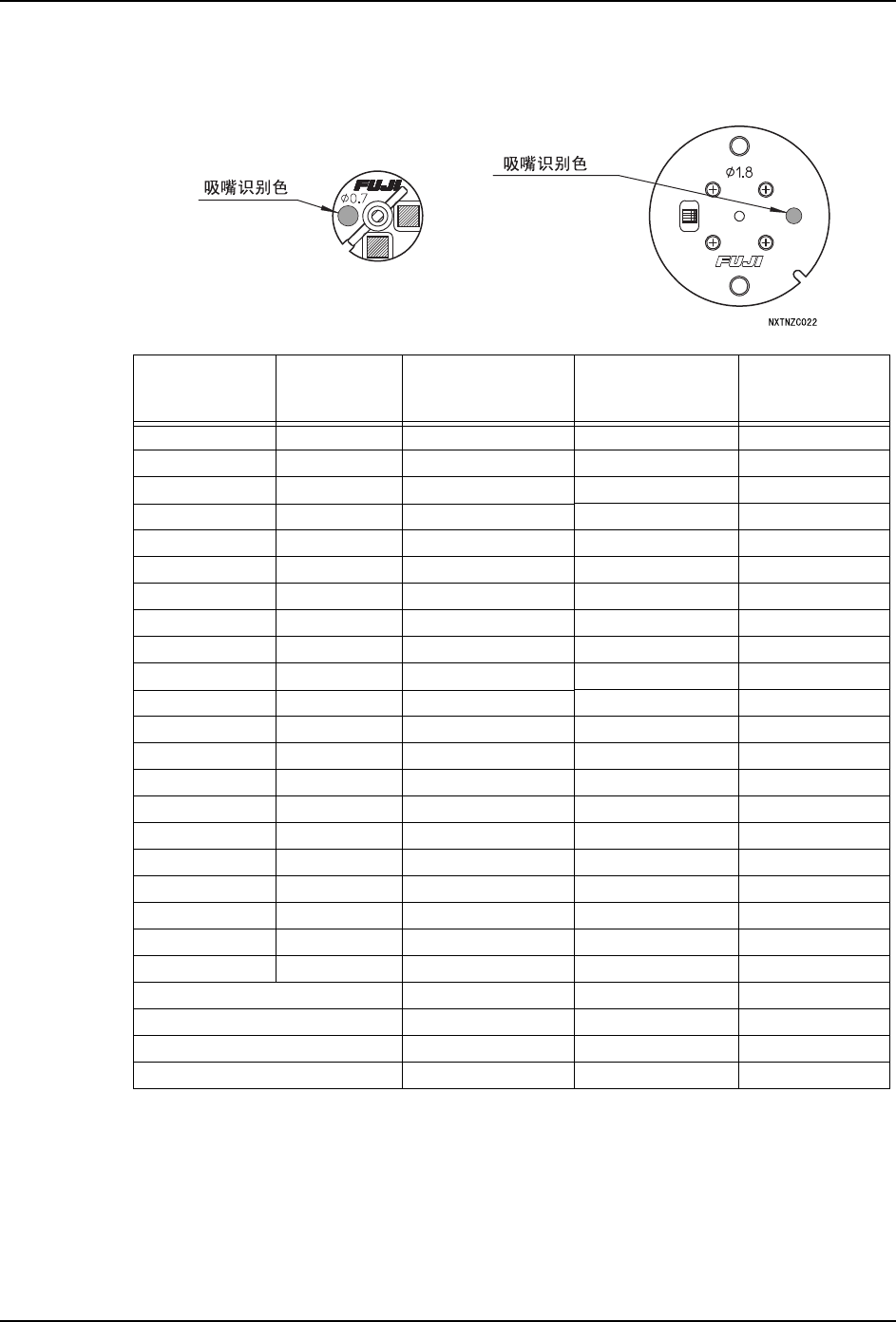 SYS-NXTIIc-4.0S 5. 换线 NXT IIc 系统手册 273 5.10.3 吸嘴一览表 所使用的吸嘴种类如下。请通过 涂敷在法兰盘上的颜色来识别各个吸嘴。 吸嘴尺寸 识别色 H08(Q)/H12S(Q)/ H12HS(Q) 用吸嘴 (ID) H08M(Q) 用吸嘴 (ID) V12 用吸嘴 (ID) φ 0.3 灰 AA1ATxx (S10) - AA1ATxx (S10) φ 0.4 黄 AA056xx (S11) A…
