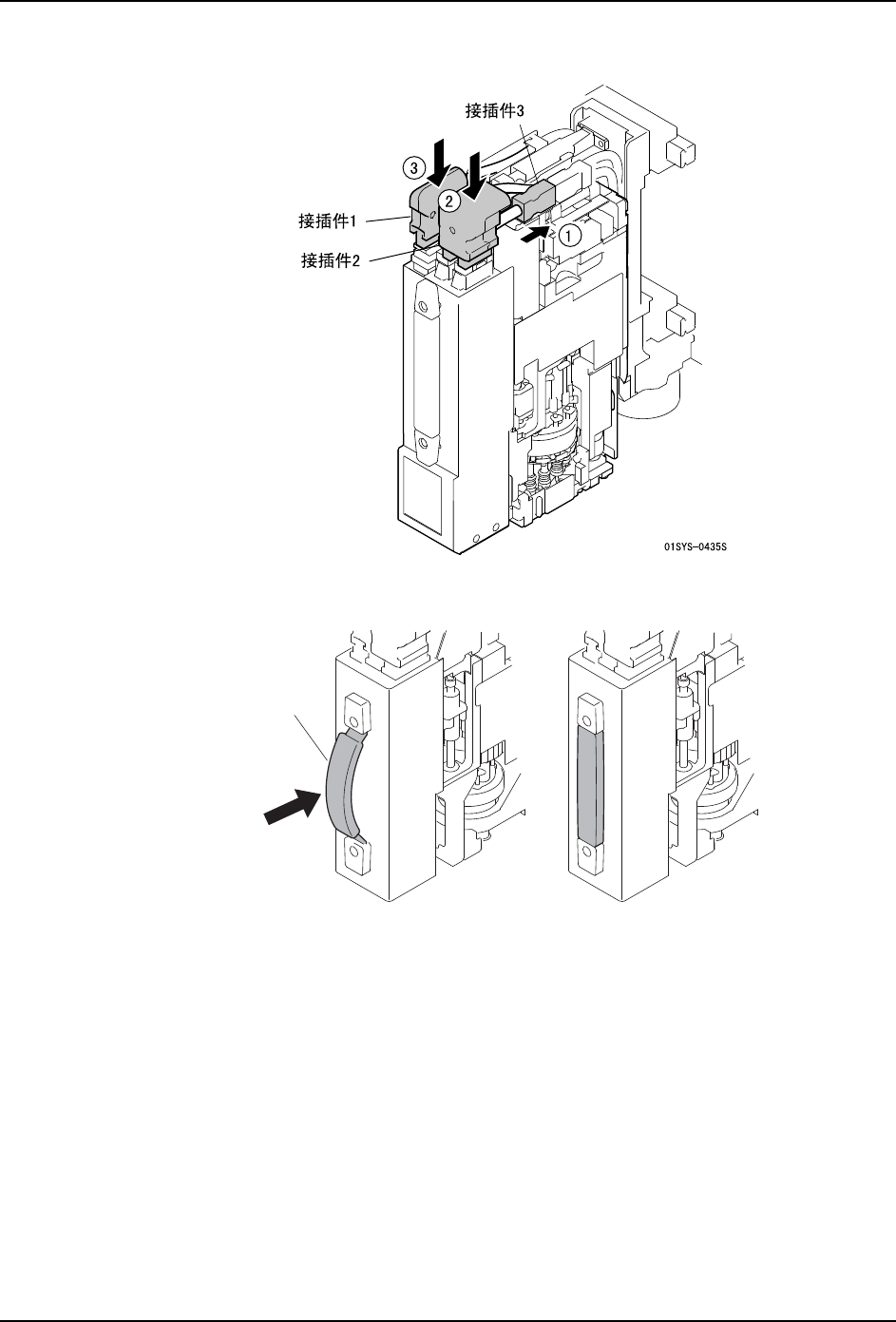 b. 握住模组的手柄,在解除模组的锁定的状态下,慢慢地插入模组,直到碰到阻停块为