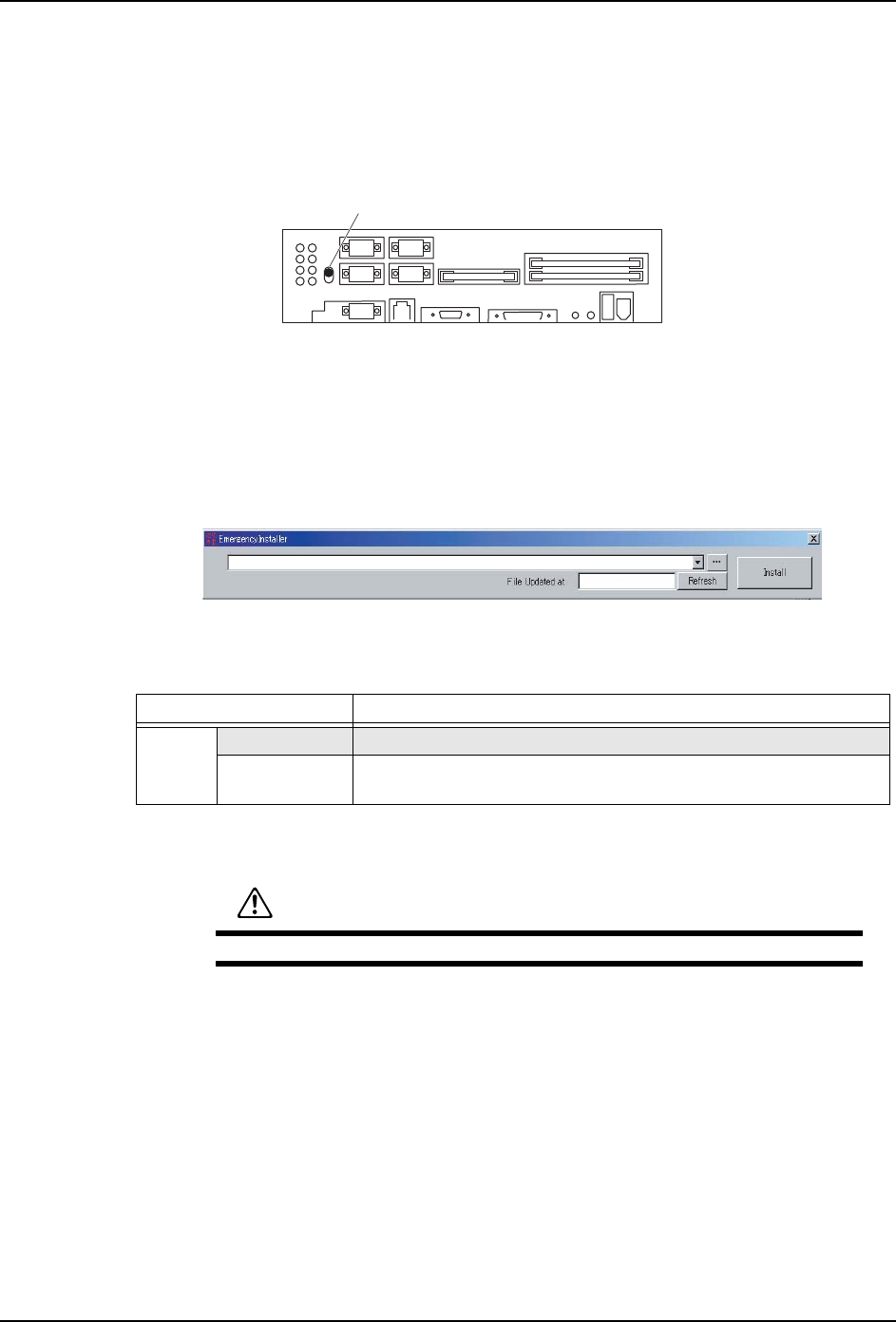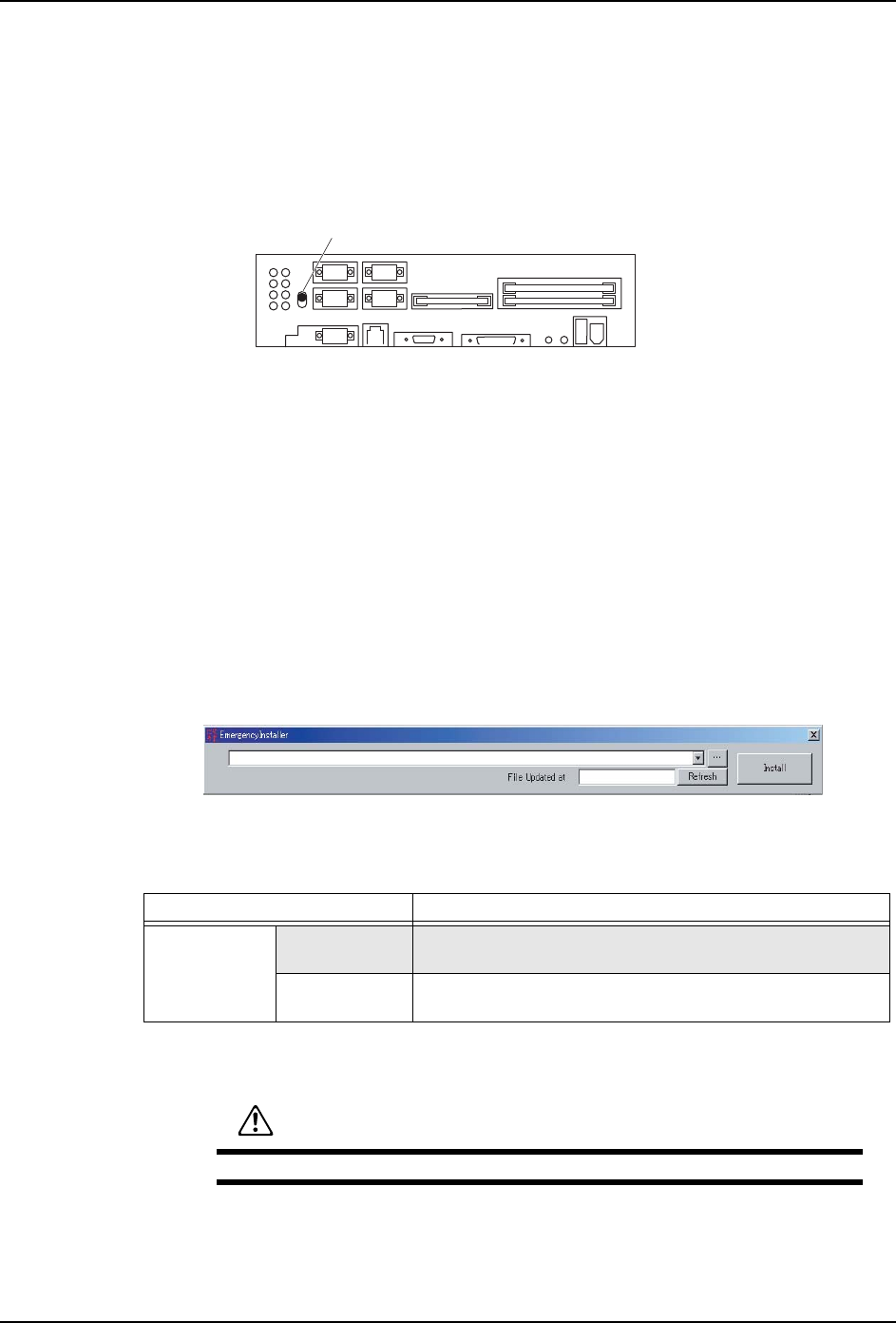 SYS-NXTIIc-4.0S 8. NXT-2c 软件工具 NXT IIc 系统手册 367 8.6.3 模组 CPU 的恢复作业 1. 使用事先准备电缆连接恢复后的 CPU 箱和 PC。 2. 将 PC 的 IP 地址变更 为 “169.25 4.0.200”。 3. 将 纽子开关向上设置。 这样将 CPU 的电 源 ON 时, CPU 就会以 emergency mode 启动。 进行 对面型机械手的模组 CPU 恢复时,同时将边…