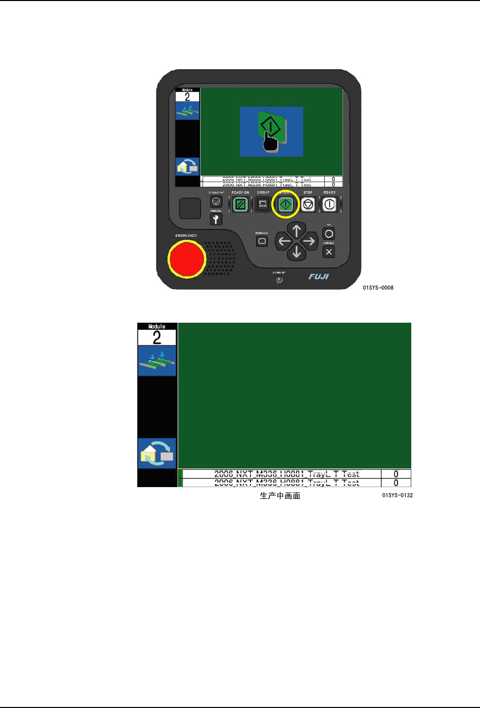 4. 生产 SYS-NXTIIc-4.0S 38 NXT IIc 系统手册 2. 从 Fuji Flexa 处传输 Job。关于 Job 传输的方法,请参照 [NXT 系列编程手册 ]。 3. Job 传输结束后,操作画面上的 Job 名就会被变更。 备注 )上图是向通道 1、2 传输了各自的 Job 后的画面。 Job for Lane 2 T T est Job for Lane 1 T T est