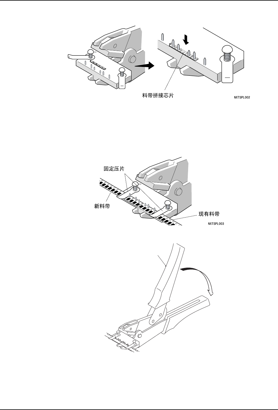 b. 使新料带的前端正好处于料带拼接芯片的正中间,然后用固定压片压住使料带不产生