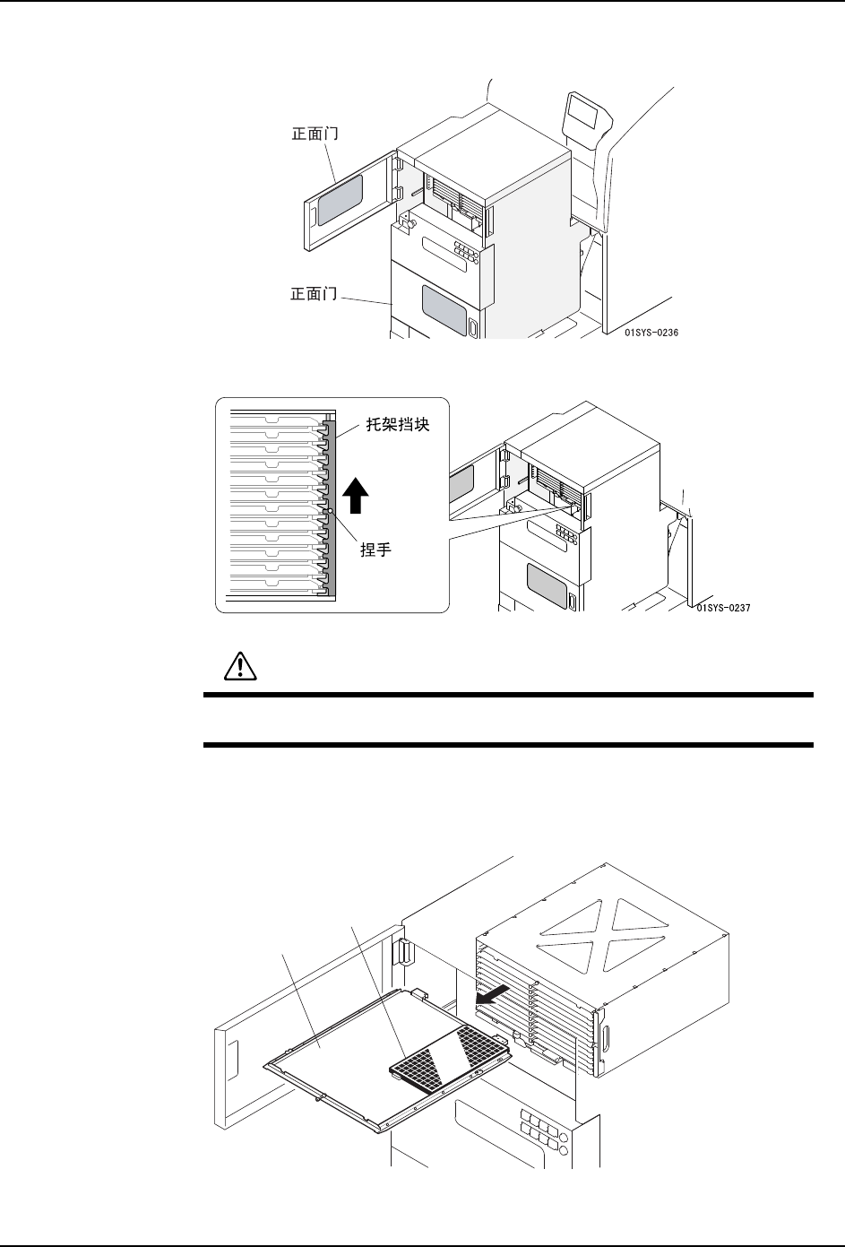 4. 生产 SYS-NXTIIc-4.0S 78 NXT IIc 系统手册 1. 打开料盘单元 -LT 的正面门。请打开补充用料盘箱的 门。 2. 请拿住捏手,抬起托架挡块。 备注 )即使在托架档块处于下降状态 时也可以半拉出料盘托架 。此为便于操作员确认 元件状 态用的规格。补充料盘元件时,请务必抬起托架档块。 3. 从排出用料槽上拔出料盘托架。 注意 不抬起托架档块就进行元件的补充作 业时,有可能损坏料盘托架或者料盘 箱。 6&…