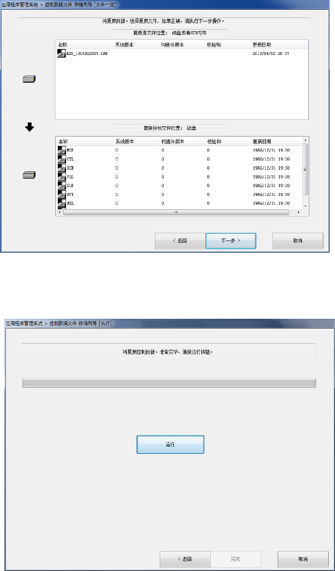 第 2 部 功能 详解篇 第 13 章 程序 补充 13-16 指定复原文件位置后,按 [ 下一步 >] 按钮,显示如下对话框画面。 ( 以下示例为从 USB 存储器复原文件 ) 选择复原文件位置中所显示的可复原文件后,请按 [ 下一步 >] 按钮。 要变更操作内容时按 [< 返回 ] 按钮。要结束作业时请按 [ 取消 ] 按钮。 按 [ 运行 ] 按钮来保存控制数据。