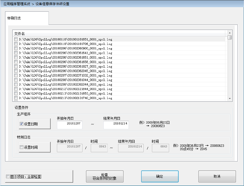 在条件设置的特别日志设置中,勾选[设置时间],并指定开始年月日、时间、结束年月日、时间,按