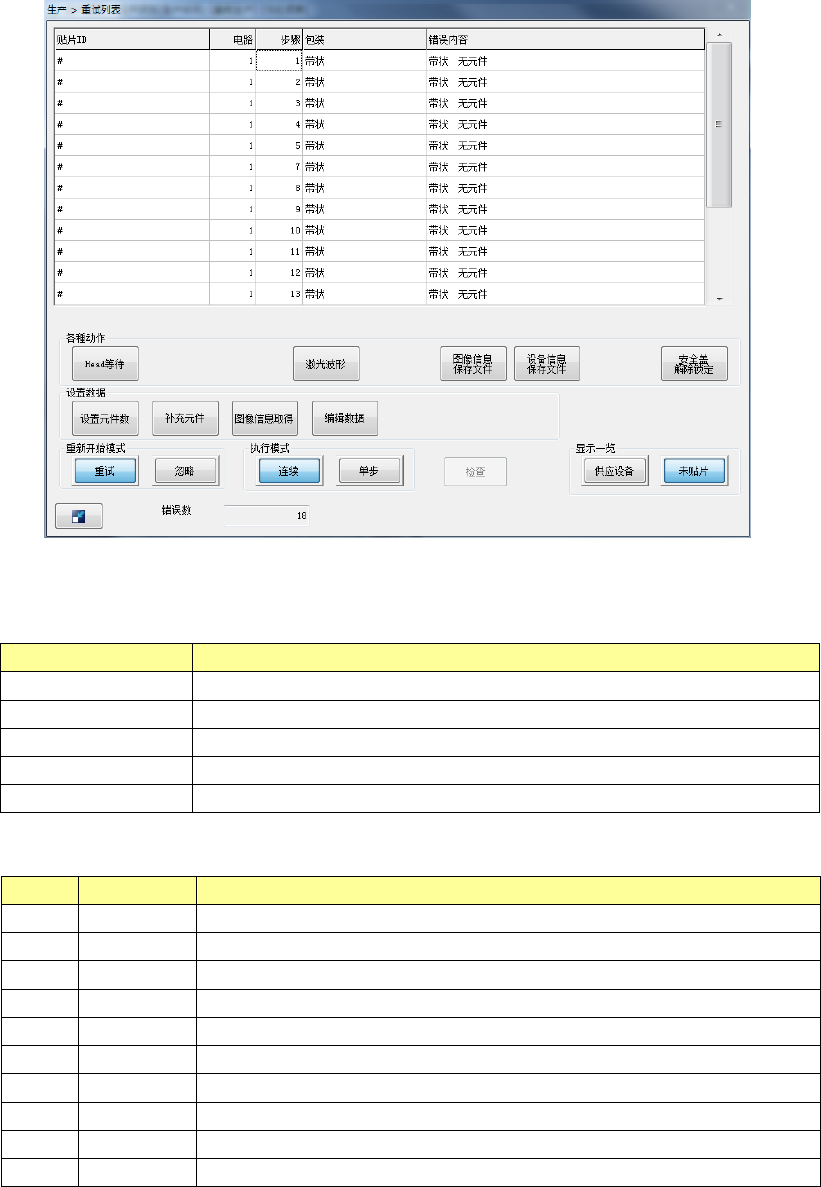 第 1 部 基本篇 第 2 章 生产 2- 80 (2) 重试列表(未贴片) 除列表显示的内 容以外,其他项 目与供应装置 相同。 1) 显示一 览 ( 未贴片 ) 按发生顺序显示 错误。 项目 内容 贴片 ID( 元件 ID ) 显示贴片失败的 元件 数据的元件 ID 。 电路 显示贴片失败的 电路号。 步骤 显示贴片失败的 贴片步骤。 包装 显示 吸取失败 的元件包装方式。 错误内容 显示 贴片失败的原 因 。 2) 错误内 容 (…