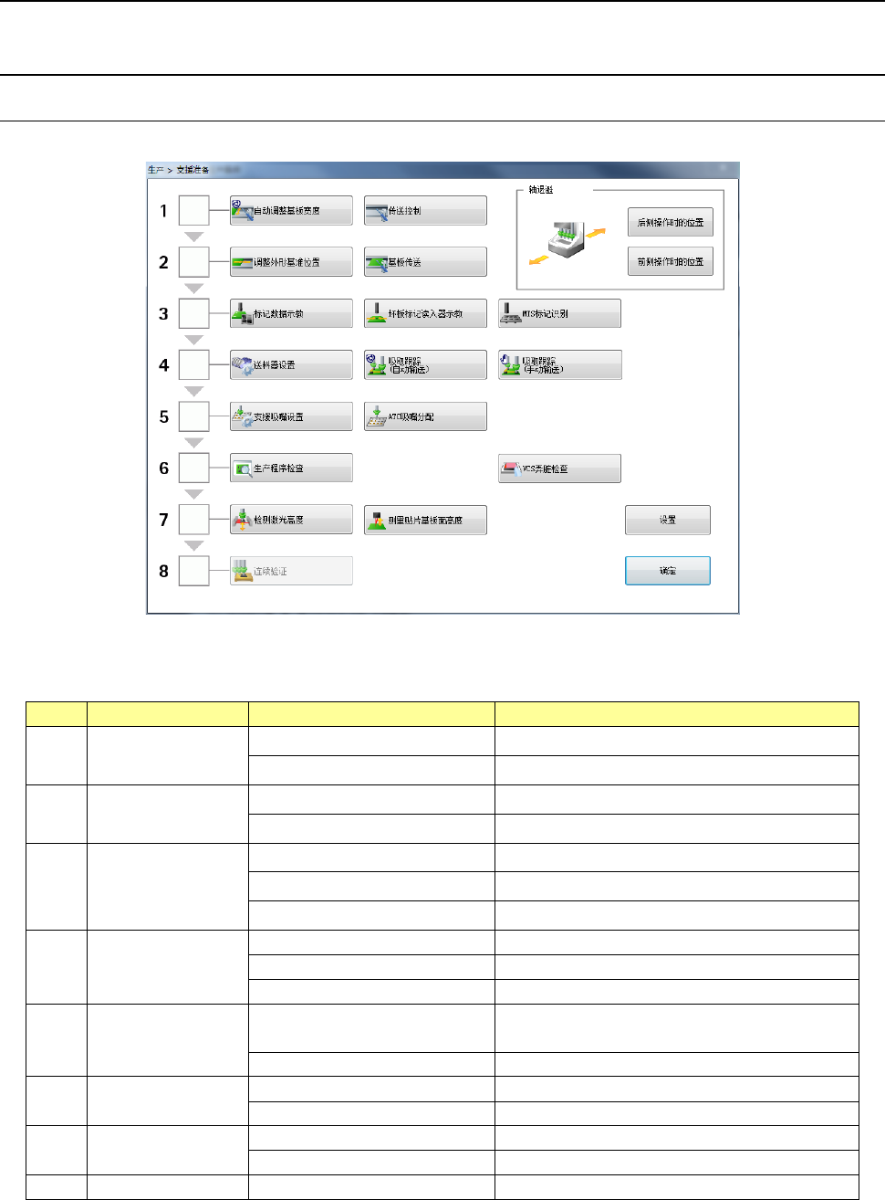 机器使用者只要按照「1.基板宽度调整」~「8.元件供应检查」项目顺序依次完成操作,即可
