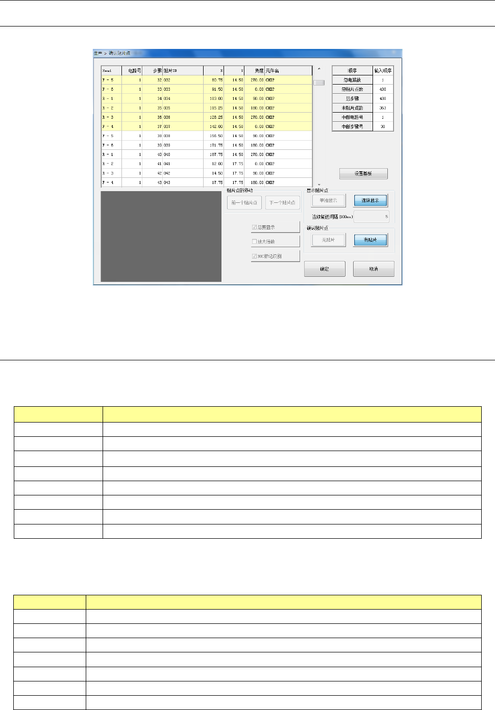在生产开始前显示贴片列表,显示各贴片点,可以确认元件是否已全部贴片,