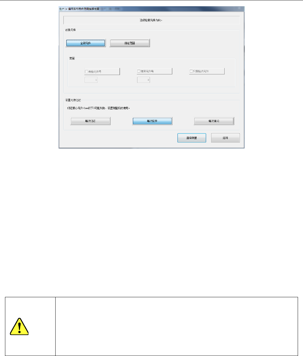 第 1 部 基本篇 第 2 章 生产 2- 120 2- 12 -4- 4 连续检查 (1) 对象元件 只检查元件数据 中与某种条件一 致的元件时, 进行此项设定。 1) 全部元件 从所有元件数据 中检查 S OT 的元件、或通用图 像元件 。 2 ) 指定范围 要对于对象元件 的某些元件编号 进一步检查时 ,请勾选此项。 勾选后,可指定 以下 内容。 ● 开始元件号 指定开始检查的 元件数据的编号 。 ● 结束元件号 指定结束检查的 …