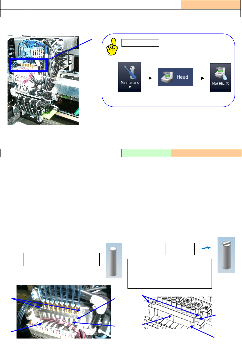 第 1 部 基本篇 第 3 章 维护 3-5 1) 请确认没有 漏气。 1) 接通 主机 的 电源后,请选择 「 手动控制 」项目,检查下列 各项目的动作 状况。 ① 基板挡块部 ② AT C 单元 手动控制 「 操作说 明书 第 9 章 手动控制」 此功能用于确认 各项动作、检查 传感器的开/ 关。 检查项目 3-1- 3 管道及接头 实施频度 : 每周 检查内容 检查气压管道部 分是否漏气 检查项目 3-1- 4 各单元气缸 实施频…