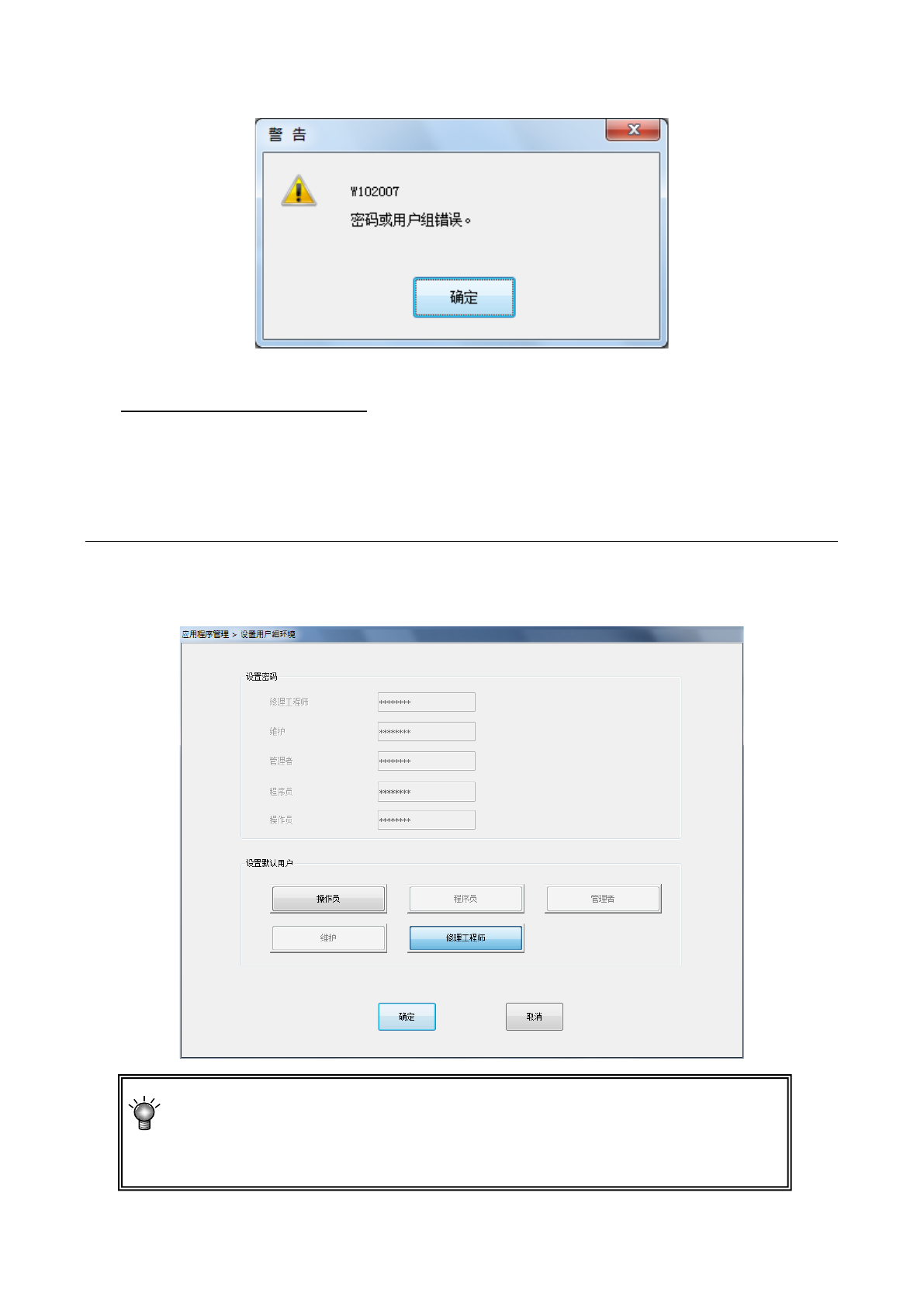 如果用户组与密码不一致,会显示以下提示信息。