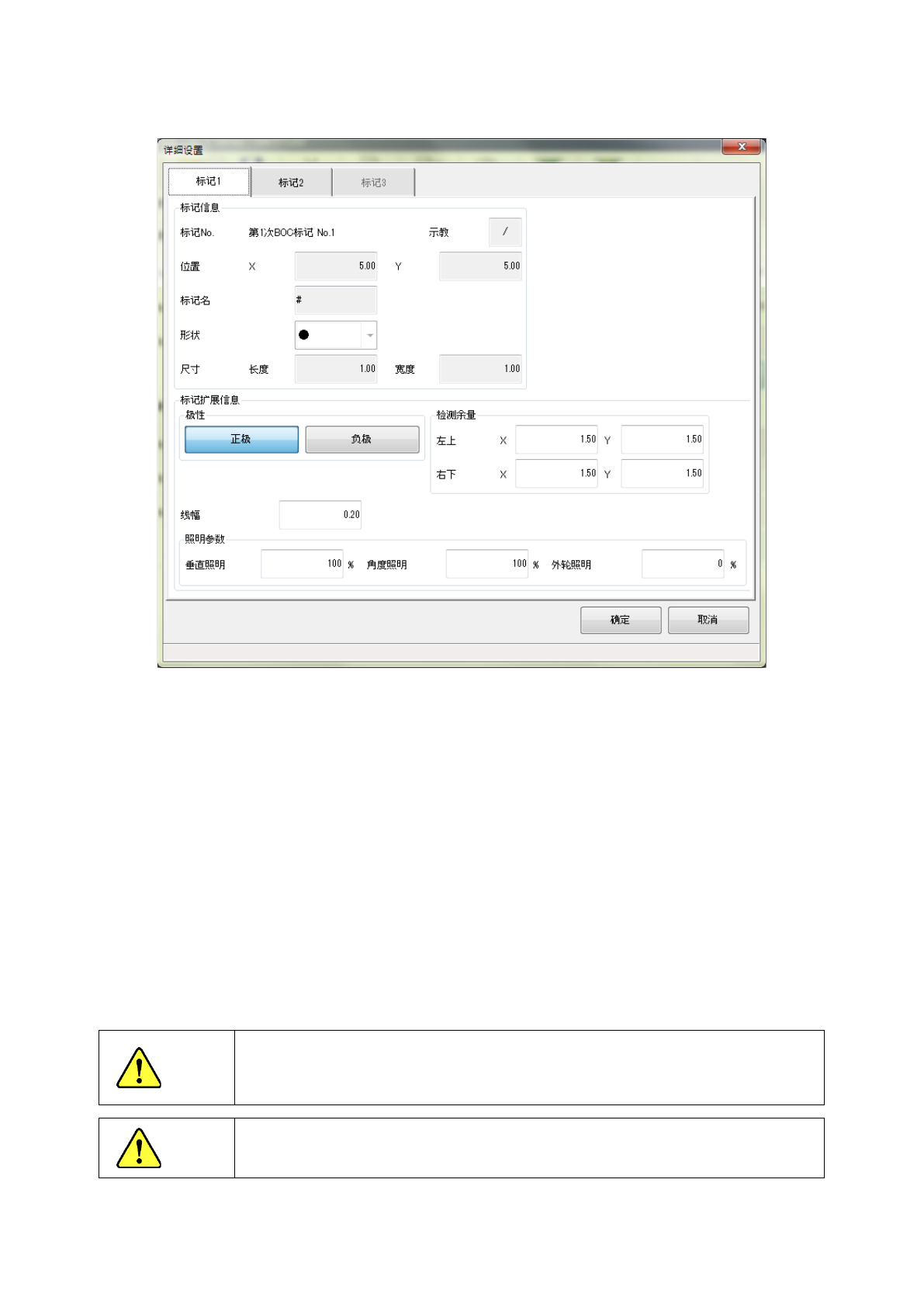 第 1 部 基本篇 第 4 章 制作生产程序 4- 24 按下详细设置按 钮,即显示如下 画面。 可使用标记的 No.1 ~ 3 选项卡 进行切换 。 (1) 标记信息 显示 B OC 标记画面 中设置 的信息。 (2) 极性 设置是否反转拍 摄图像的明暗。 (3) 线幅 输入标记的线宽 。但对于无需线 宽的形状,则 不使用该数值。 (4) 检测余量 以距离标记外形 的距离输入识别 标记时检测框 的尺寸。 (5) 照明参数 输入拍摄标记…