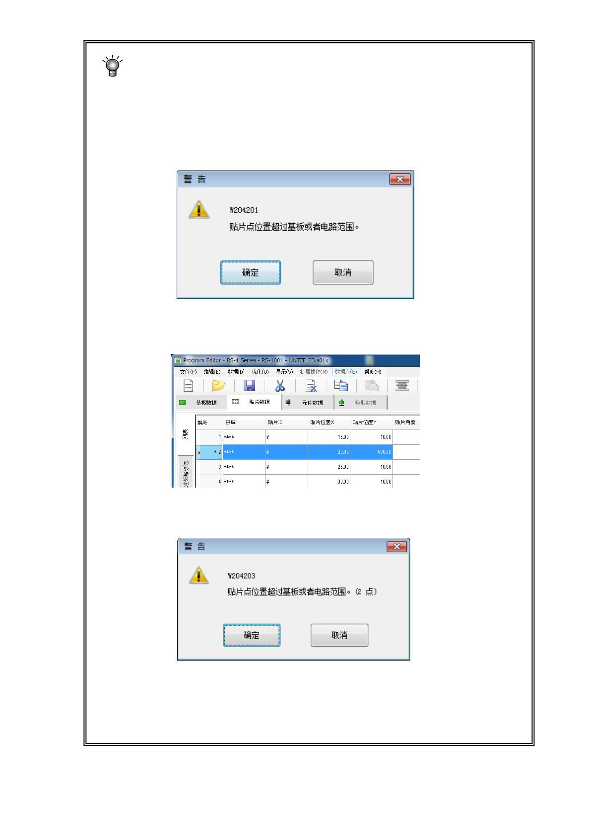 在输入贴片位置 X 或 Y 时,或分别进行了改变时,将进行范围检查。