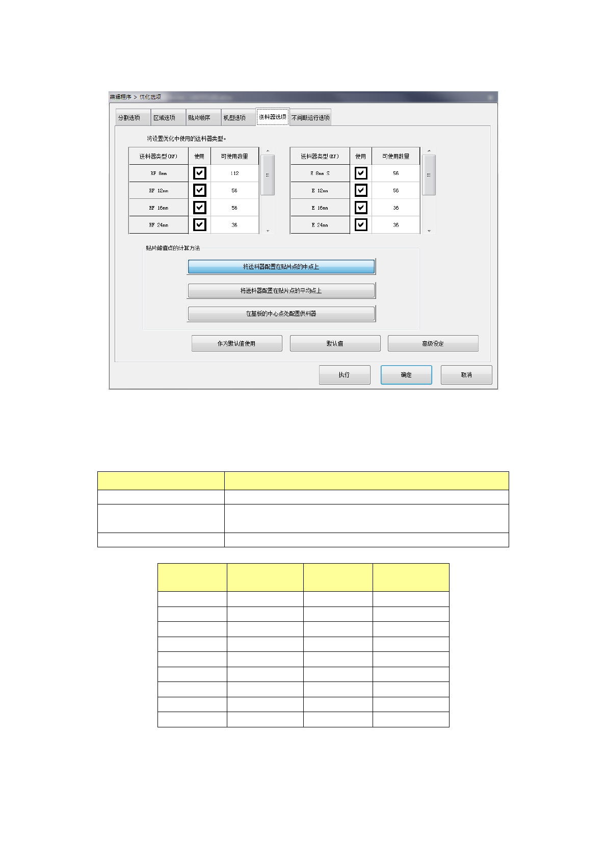对优化中使用的供料器类型及供料器配置的计算方法进行设置。