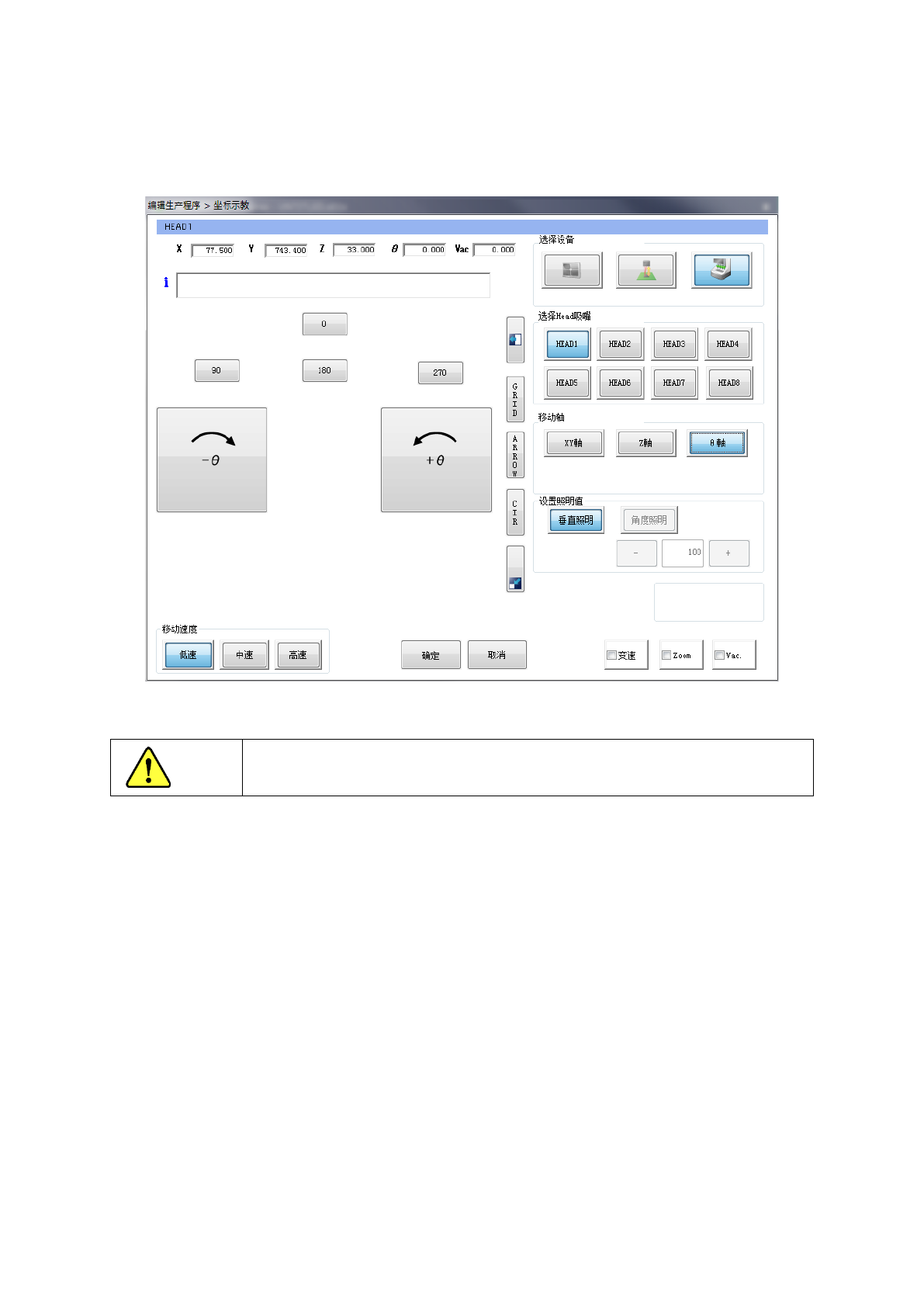 按[0]、[90]、[180]、[270]按钮,吸嘴 Head 即旋转到各数值的角度。