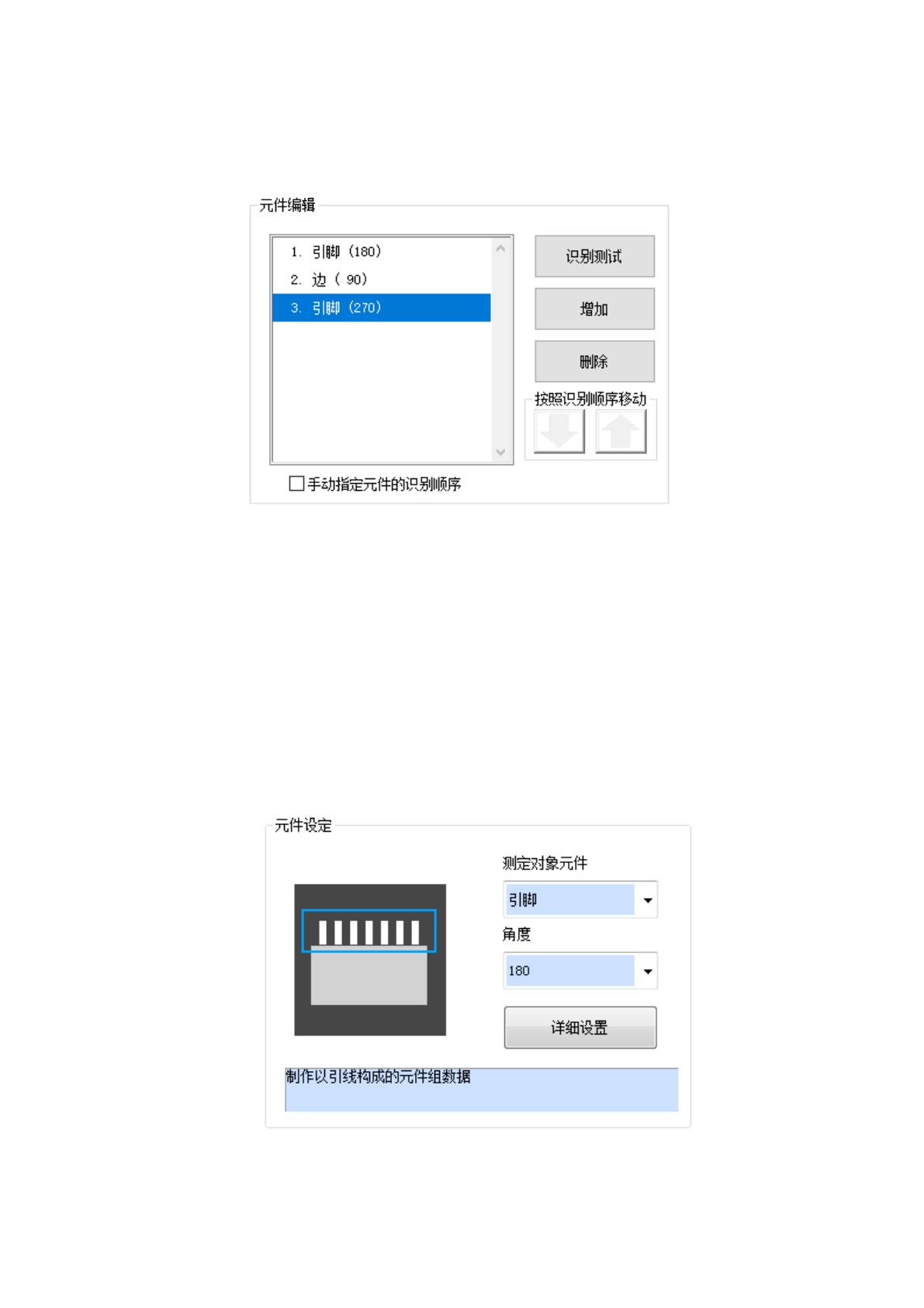进行多个元件要素组的追加、删除、识别顺序的设置。也可进行识别测试。在元件要素编辑初始