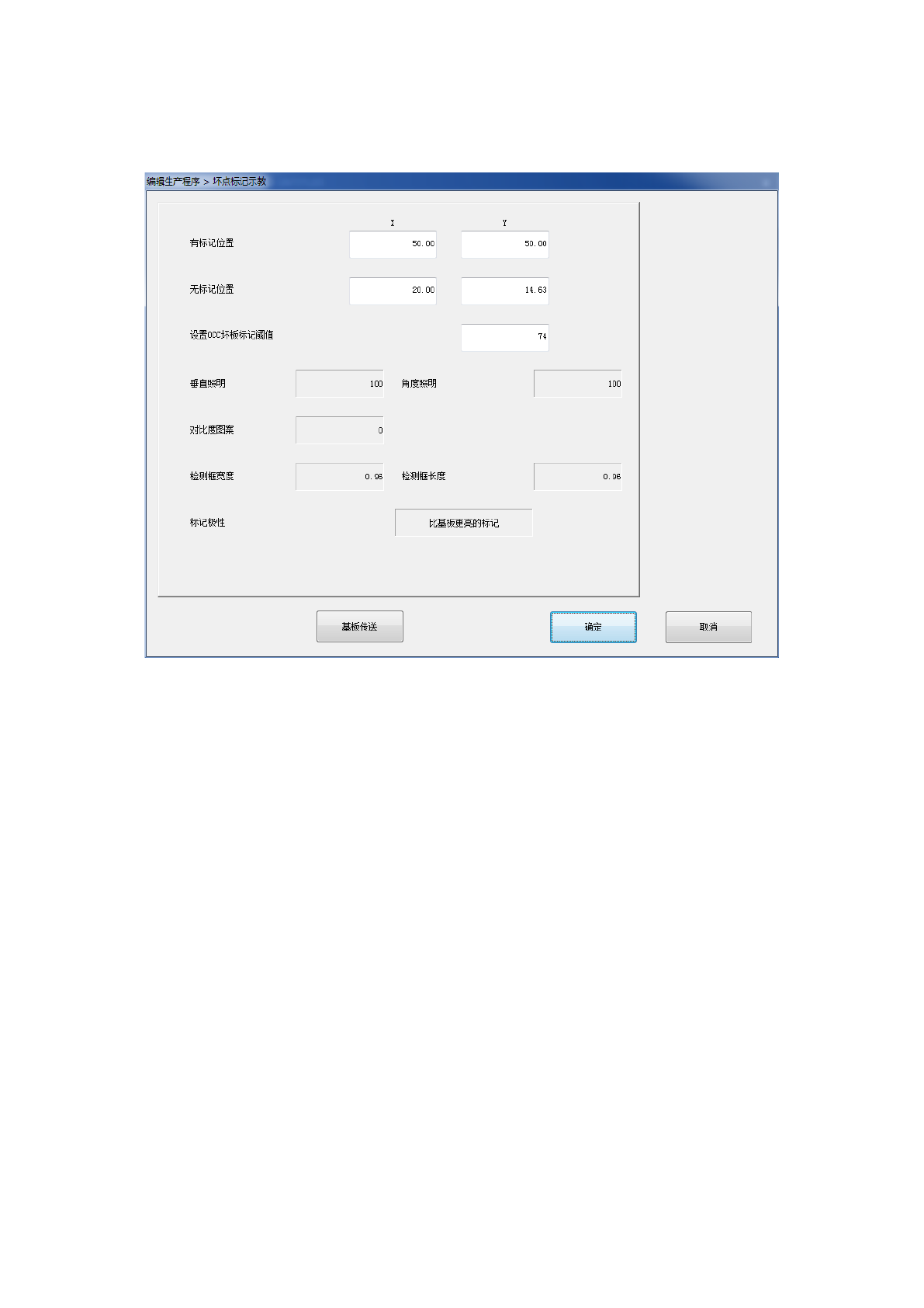 在 OCC 坏板标记阈值设置中使用示教对有标记位置及无标记位置进行识别动作,成功取得阈值
