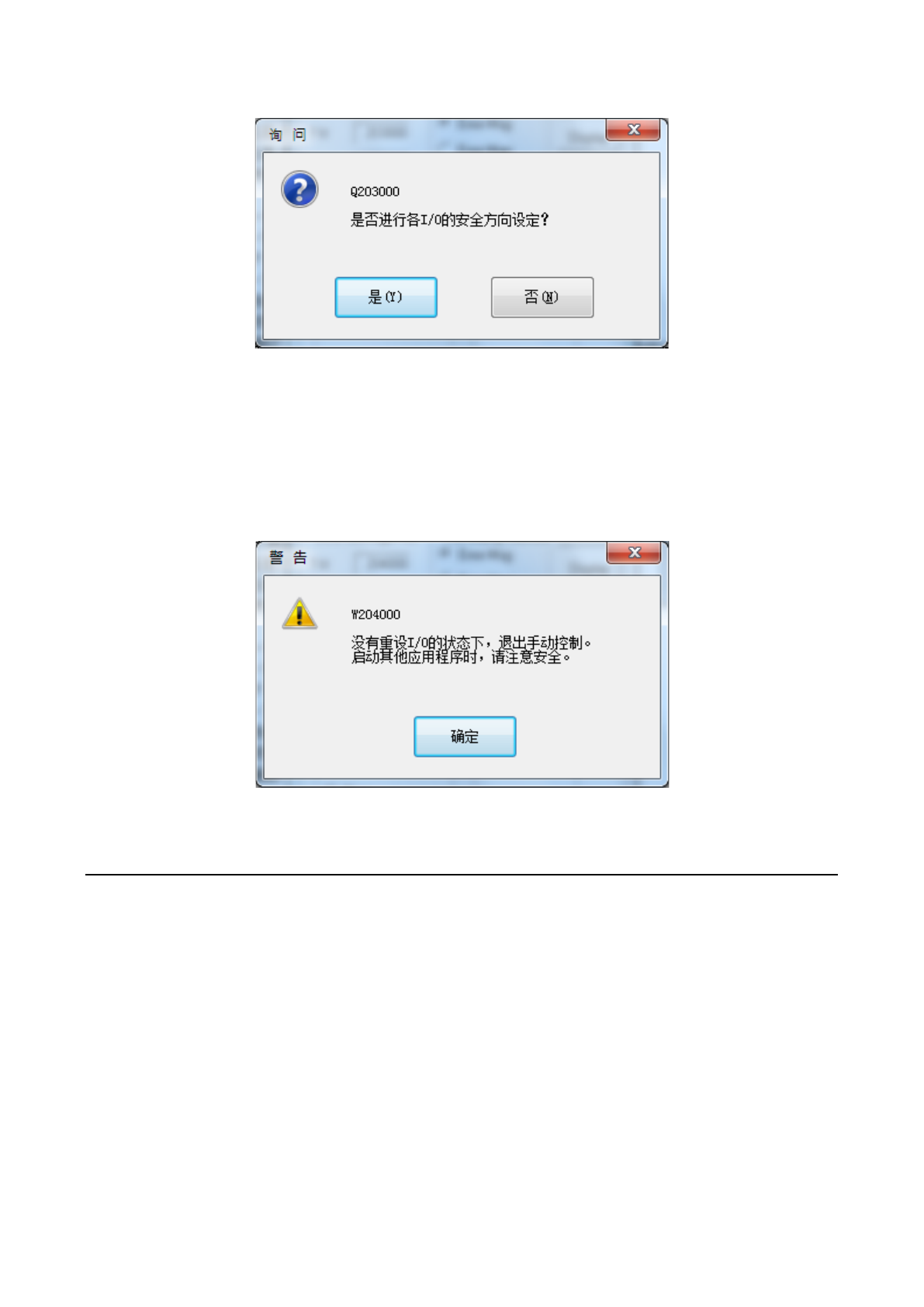 在各 I/O 安全方向设置确认提示信息中选择「否」时,会显示以下提示信息。