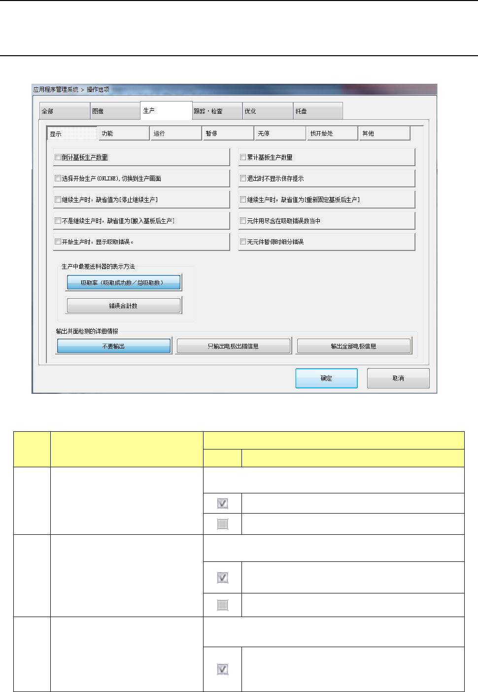 第 2 部 功能详解篇 第 7 章 操作选项 7- 10 序号 项目 内容 状态 动作及详细内容 4 退出时不显示保 存提示 对退出生产条件画面 时是否询问保存生 产程序进行 设 置。 退出生产画面时 不询问保存生产 程序。 5 继续生产时, 缺省值为 「停止继 续生产」 对按 下 <ST AR T> 开关 显示的生产开始前处理对话框 ( 有 继续生产文件时 ) 上是 [ 继续生产 ] 、还 是 [ 不继续 生产 ] 的单 …