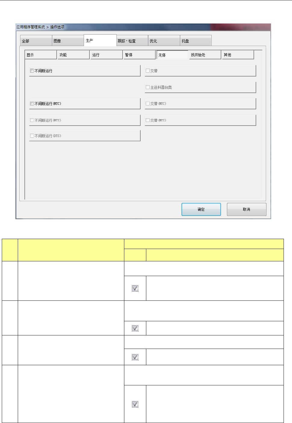按下[无停(不间断运行)]按钮,会显示“不间断运行选项设置画面”。