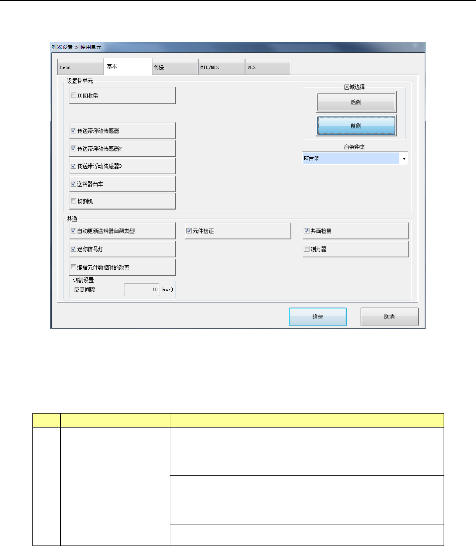第 2 部 功能详解篇 第 8 章 机器设置 8-9 为了完成生产程 序贴片,需要上 述单元时,实 际可否进行贴片 ,请见下表。 No. 单元 生产动作 1 IC 回收带 (前部、后部) 只要删除功能, 即可执行贴片。 2 供料器翘起传感 器 (前部、后部) 只要删除功能, 即可执行贴片。 3 供料器台架统一 更换台 (前部、后部) 只要删除功能, 即可执行贴片。 4 切割机 (前 部、后部 ) 只要删除功能, 即可执行贴片。 5 区域…