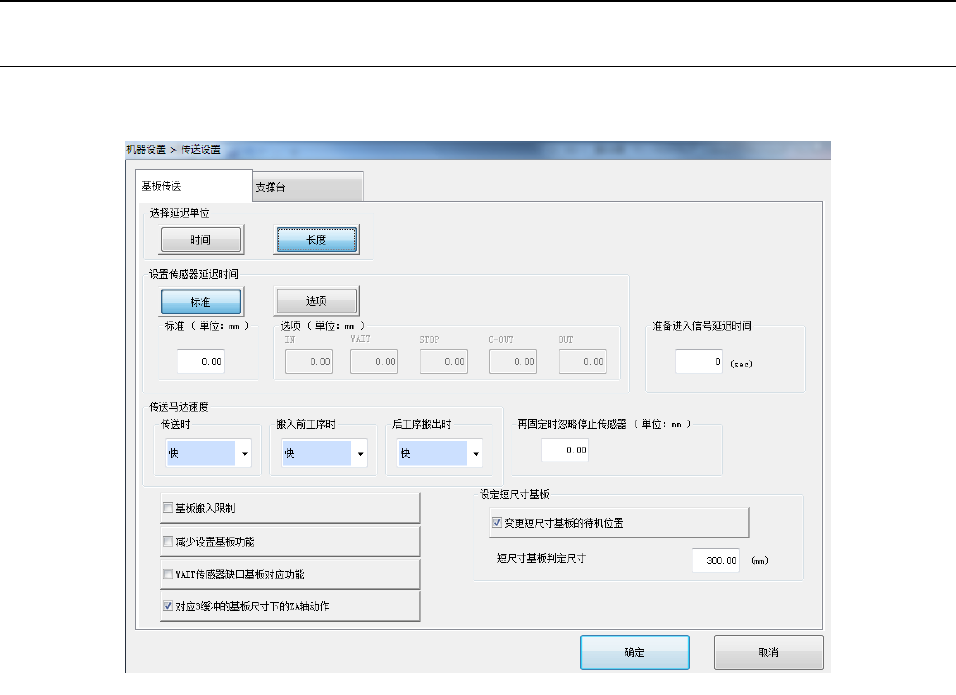 c) 选择[长度]时,基板传送传感器延时中设置的值作为 mm、1/100mm、或 inch 处理,