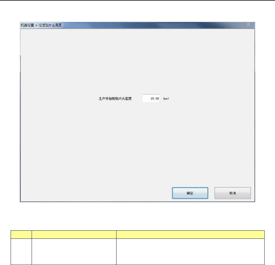 第 2 部 功能详解篇 第 8 章 机器设置 8- 40 8-3-5-5 贴装头高度设定 选择贴装头高度 设定后,将显示 以下画面。 (1) 设置项目 No. 项目 设置内容 1 生产开始前贴片 头高度 对生产时贴装头 能够下降的高度 进行设定。 贴装头( ZA 轴)在生 产开始前移动 到在此所设定 的高 度以上,开始生 产。 (2) 设置方法 1) 用直接输入 到编辑框。