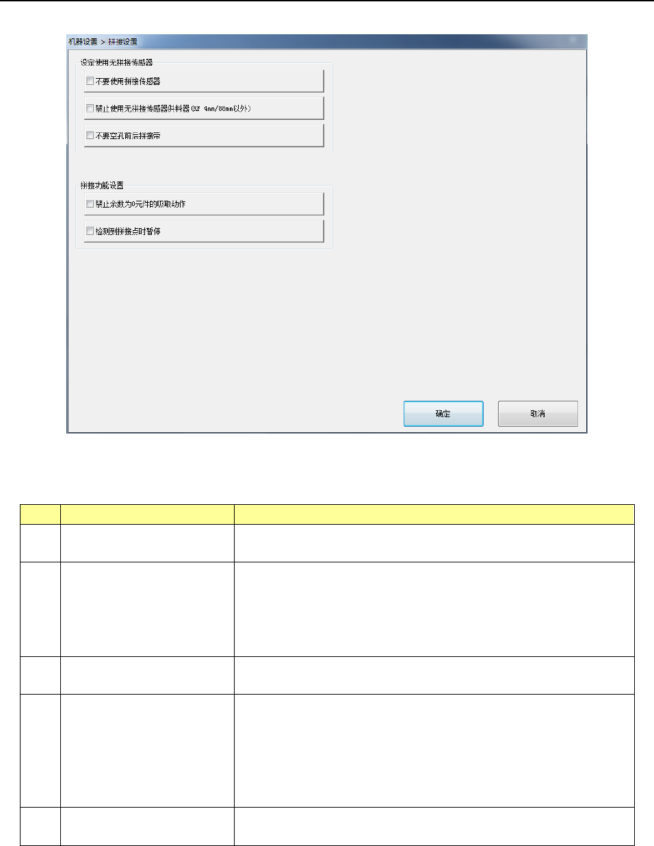 中安装了无拼接传感器的供料器时将停机。