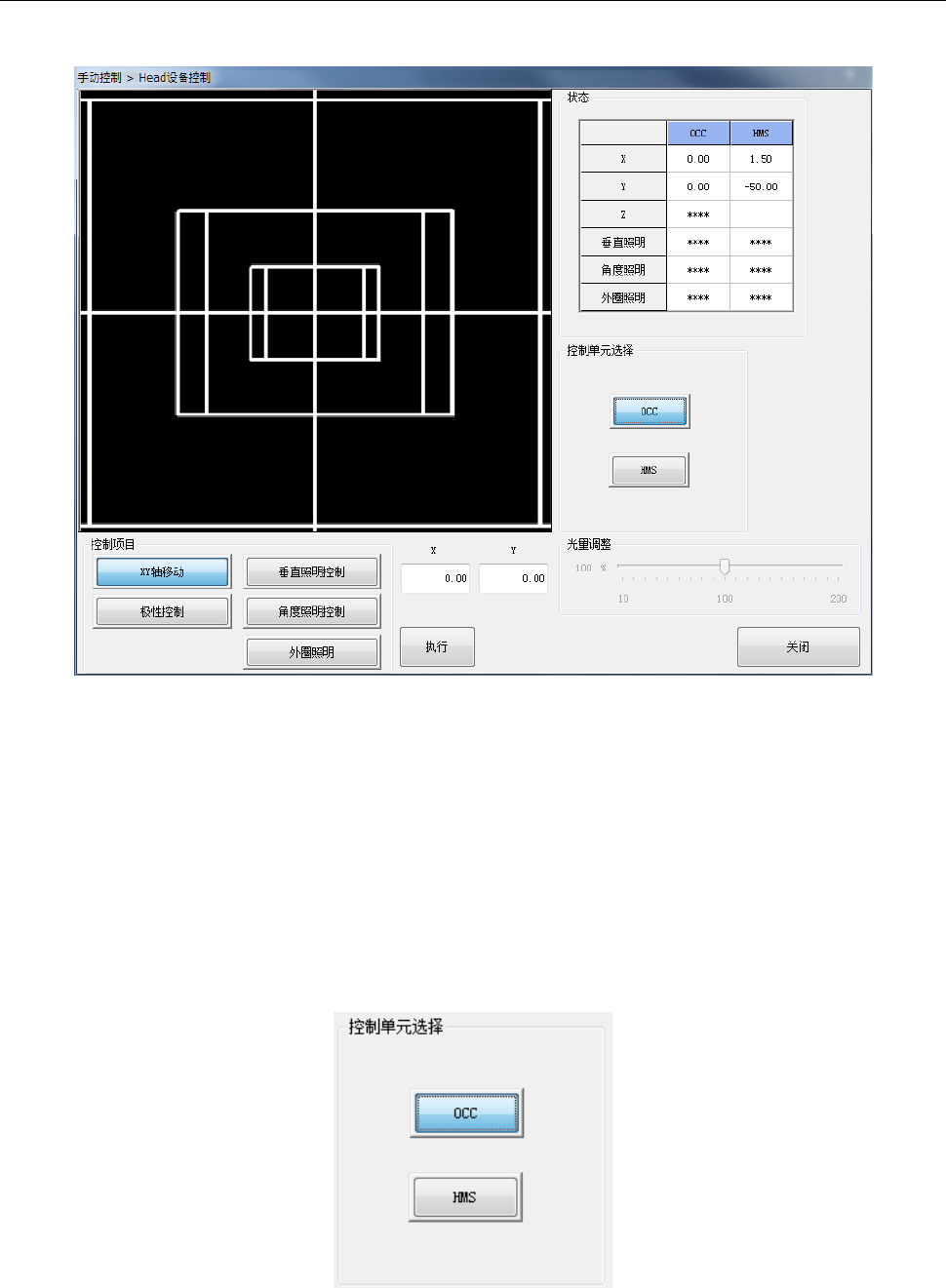 第 2 部 功能详解篇 第 9 章 手动控制 9-6 (3) 控制 项目 用单选按钮选择 控制项目。 控制单元不同, 显示的按钮不一 样。 1) OCC a) XY 轴移动 与 Head 控制 的 XY 轴移动 相同。 b) 垂直照明 控制 对 OCC 的垂 直照明的 ON/OFF ,进行 控制。 · 移动 滑动条,设定 光量。 · 选择 “垂直照明 控制 ” 时 , 按 [ON ] 按钮, [OFF] 按钮, [ON/OFF] 按钮 …