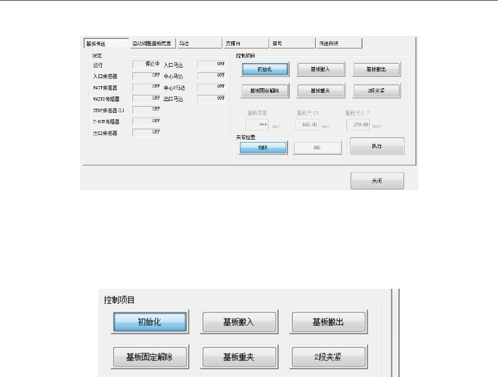 第 2 部 功能详解篇 第 9 章 手动控制 9- 16 9-4-1- 1 控制对象:基板传送 按下 [ 基板 传送 ] 按钮, 即可 显示如 下画面。 (1) 状态 马达 / 传感器 的 状态,用 ON/OFF 显示 。 (2) 控制 项目 用单选按钮选择 控制项目。 按 [ 执行 ] 按钮后,即开始按 选择 的控 制执行。 1) 初始化 将基板传送进行 初始化。 2) 基板 搬入 按基板停止 方式指定的方式 搬入 基板。 基板 尺寸…