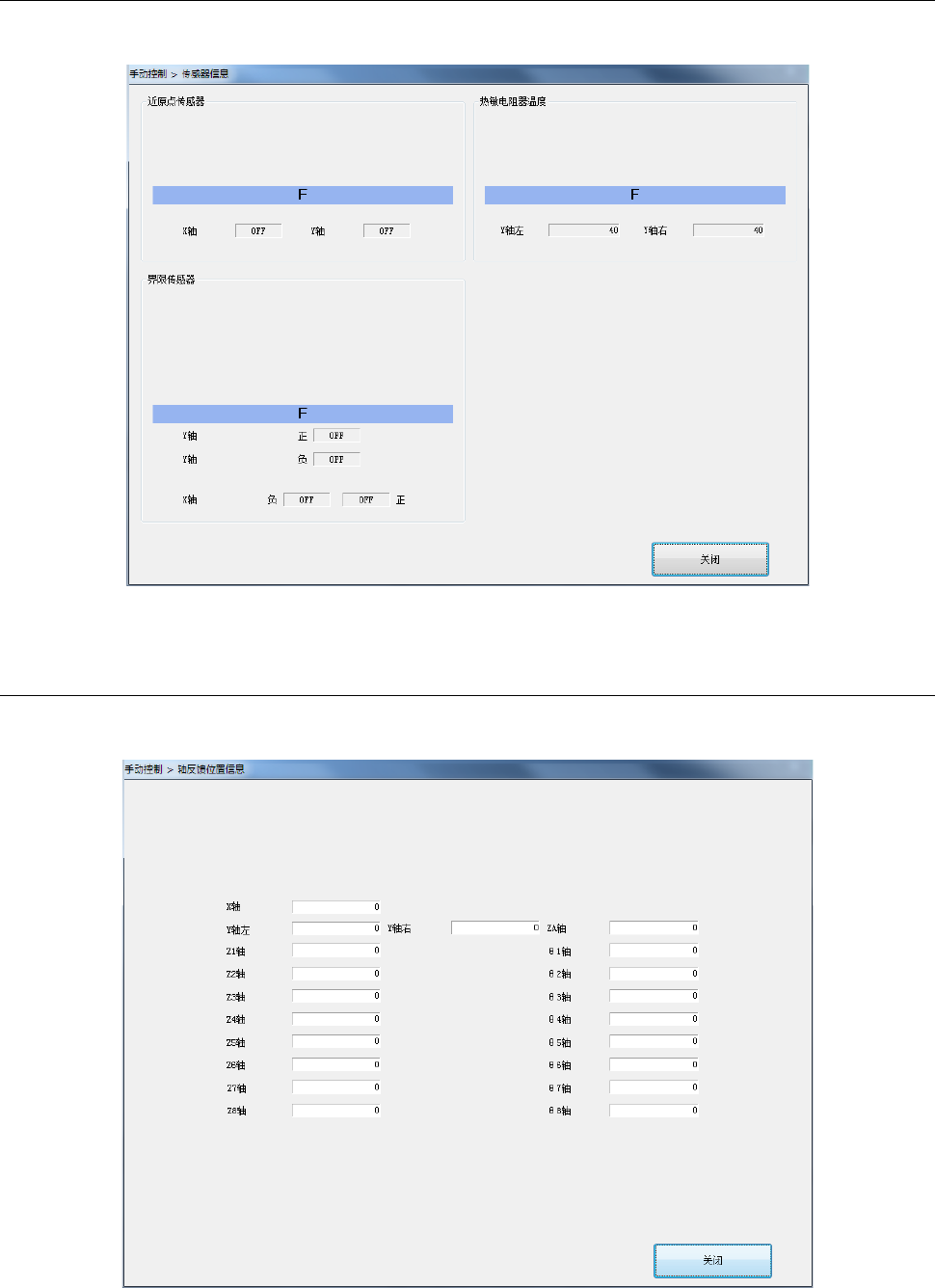 原点传感器及界限传感器状况用 ON/OFF,热敏电阻器温度的信息用各自数值显示。