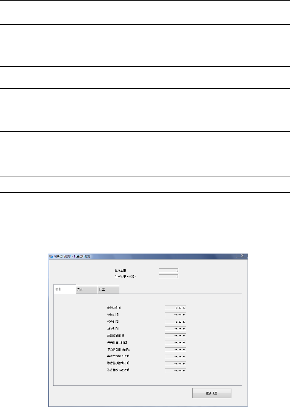 显示机器的运行时间(基板生产时间的累计等),吸嘴拆装次数等设备固有的运行信息。