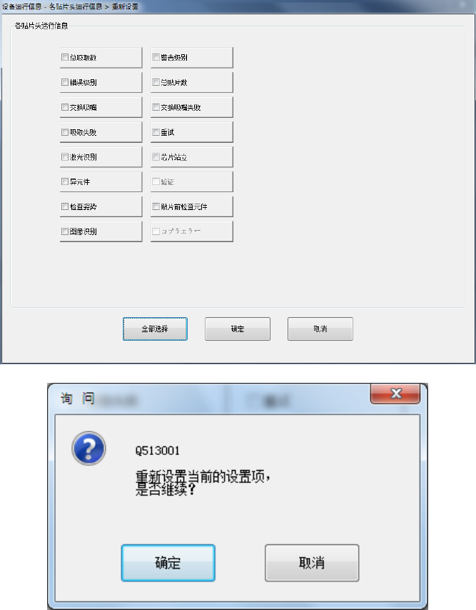 ・ 点击需要重新设置的项目复选框,按[确定]后,显示重新设置询问信息画面。