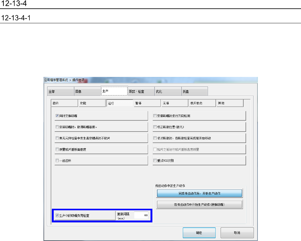 第 2 部 功能详解篇 第 12 章 选项组件 12 - 83 操作选项 生产( 动作 ) 在 操作 选项的 [ 生产 ] - [ 动作 ] 中设定 [ 生产中的吸嘴 负荷 检查 ] 为有 效后, 生产 开始 时 ,以及 生产 中 在经过指定 时间 (更新间隔 ) 时,会对生产 中 使用 的 低负荷 吸 嘴的 负荷 数据 进行重新取得 ( 在基板搬 入 时实施 ) 。 这样,可配合固 定吸嘴的状态进 行使用 负荷属性的 负荷控制。