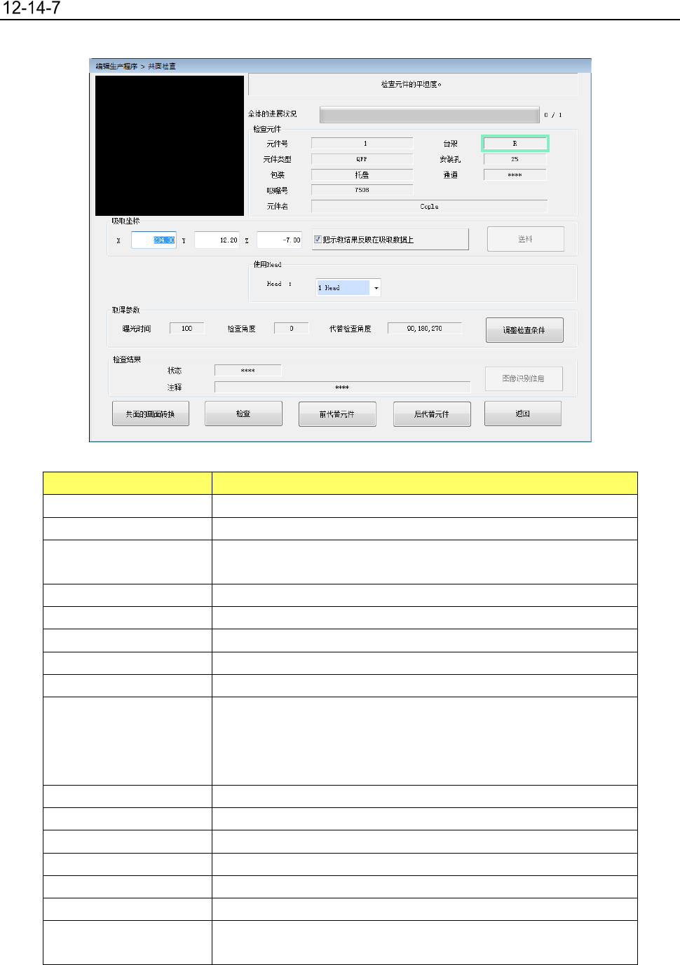 第 2 部 功能详解篇 第 12 章 选项组件 12 - 100 编辑辅助 请启动「 编辑程序 」 , 选择 「元件数据」 ,从 「测量 ・ 检查」 中选择 「共面 检查 」。 项目 内容 检查 元件 显示进行 共面性 检查 的元件 内容。 吸取 坐标 显示吸取元件的吸取位置 的 内容。 把示教结果反应 在 吸取 数据 上 选择将示教的 结果反映到 吸取 数据 。 取消勾选时,仅 适用本次吸取时 的坐标 。 [ 送料 ] 按钮 顶推一次…